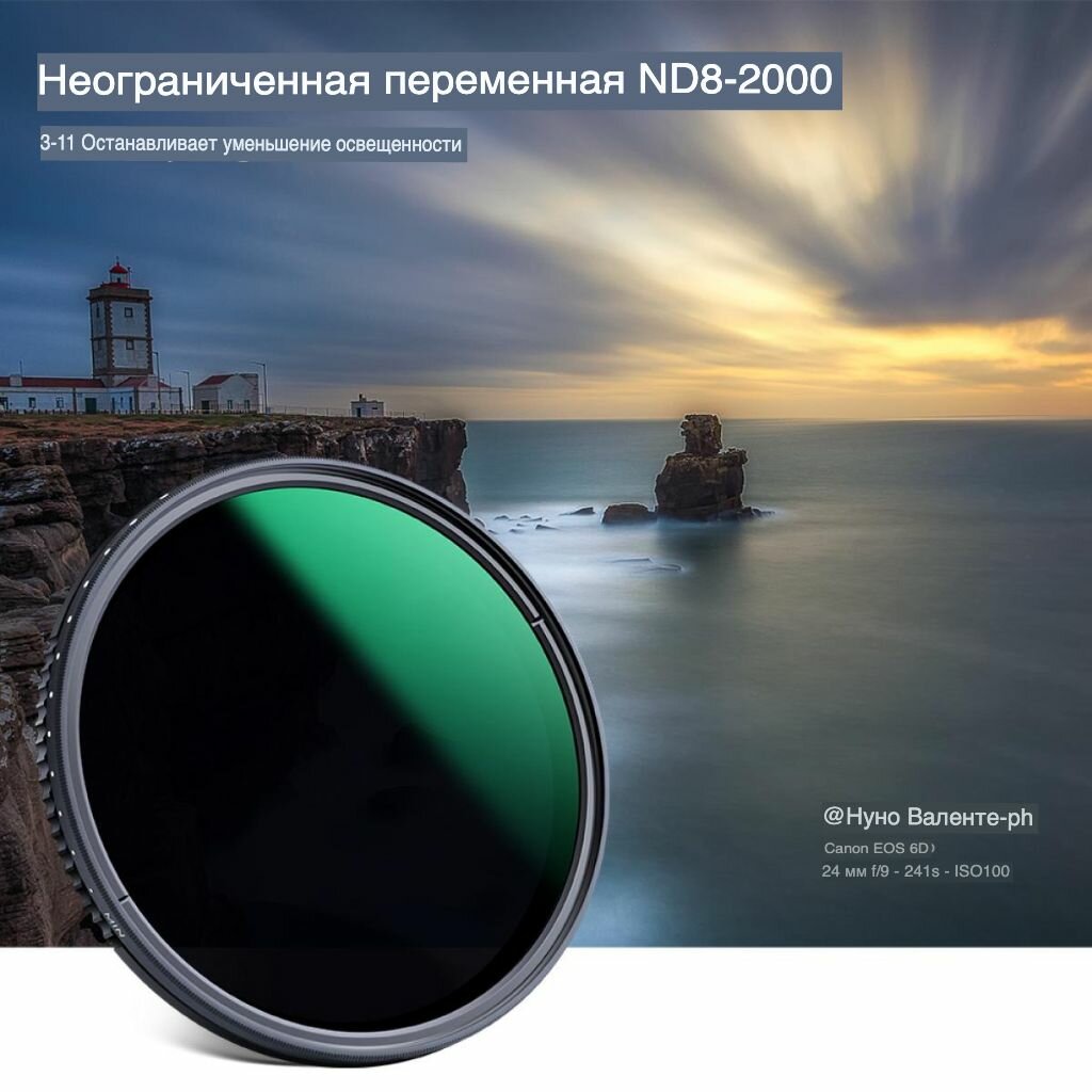 | Состав набора | K&F Concept переменный нейтральный ND фильтр, водонепроницаемый, с защитой от царапин, series A, MV36 , Slim, Green Coated, Variable/Fader NDX ND8 -ND2000 -1 шт. Кейс пластиковый для хранения фильтра - 1 шт. |
