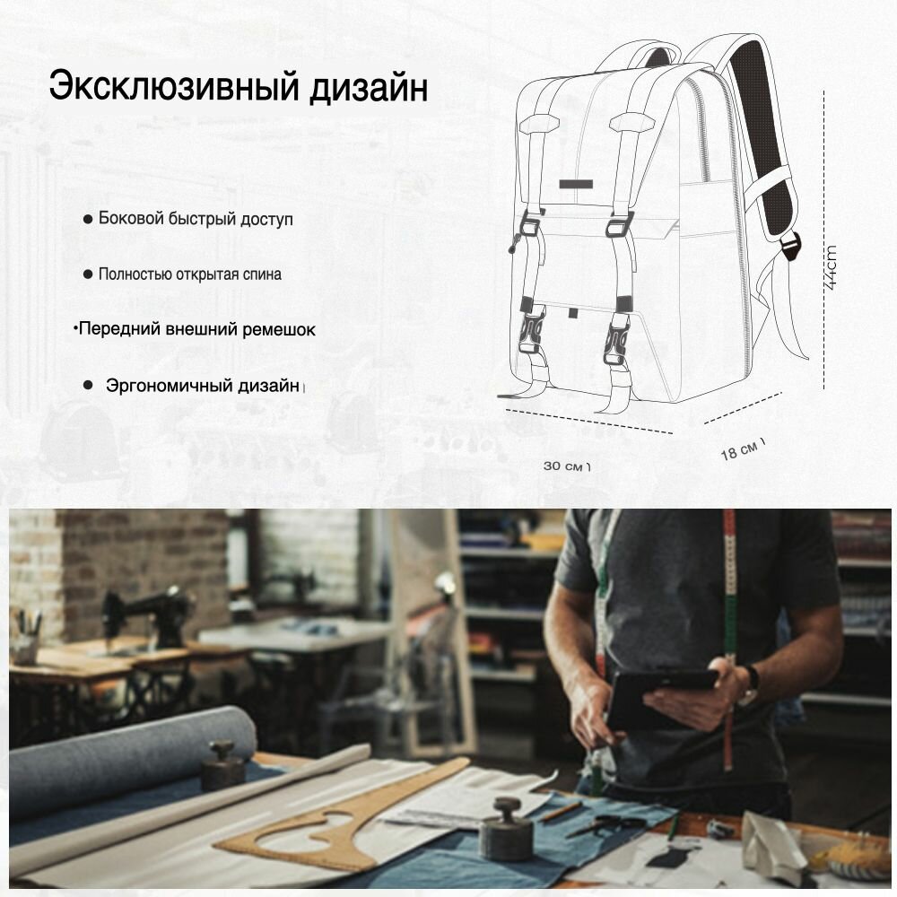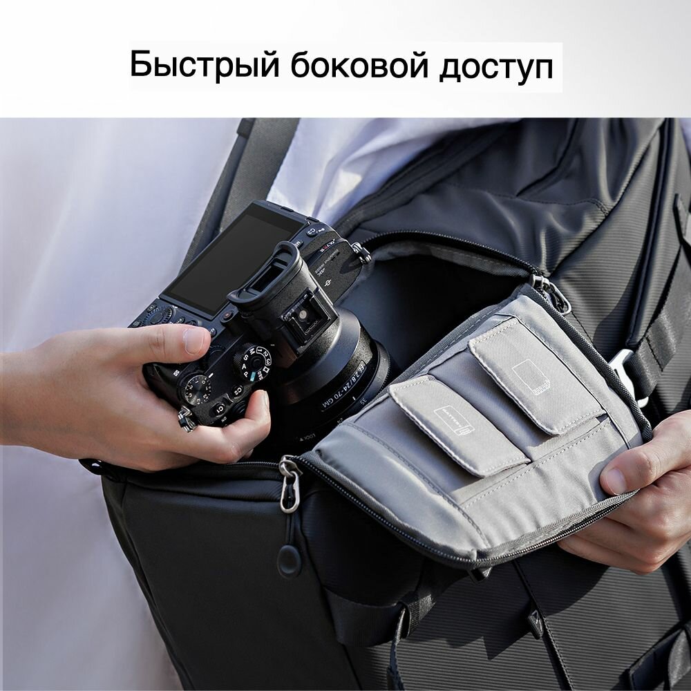 | Особенности | адаптация к фигуре, быстрый доступ, вентилируемая спинка, внешний карман, возможность организации внутреннего отсека, возможность фиксации на поясе, дождевик в комплекте, защита от воды, крепление для штатива, место для дополнительного объектива, модульная конструкция, отсек для личных вещей, плечевой ремень, ручка для переноски |