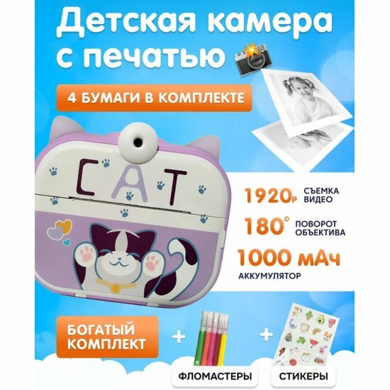 Детская камера Kid Joy P13 Purplec печатью фотографий c картинкой кота Cat Print Cam 24' HD фиолетовая интересное:
