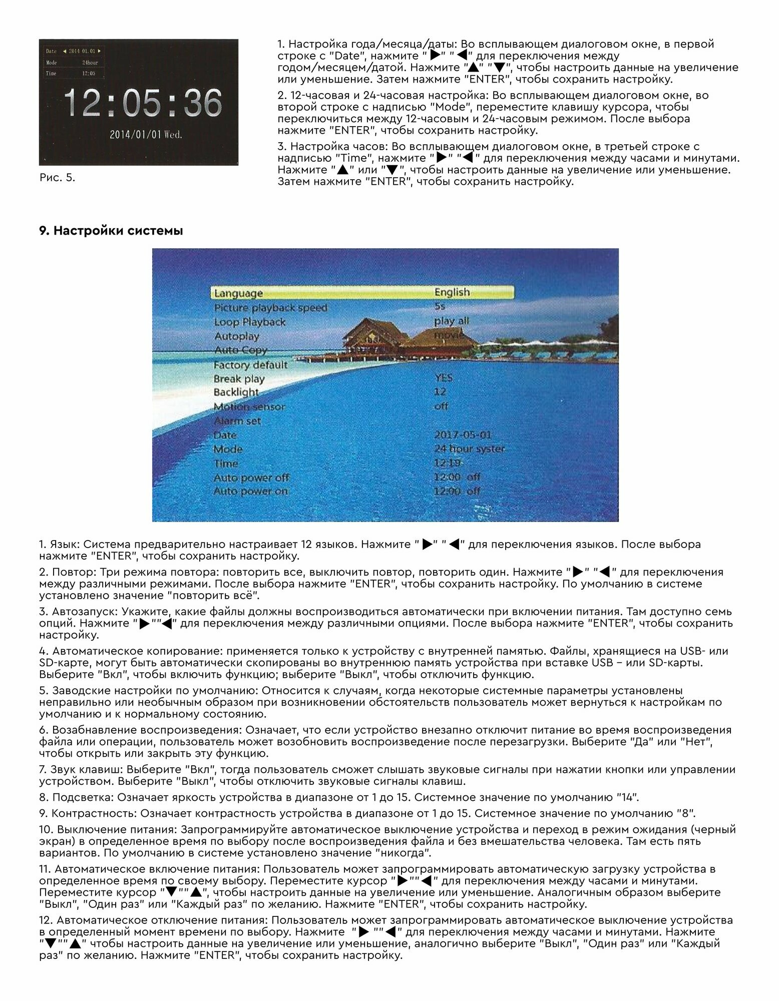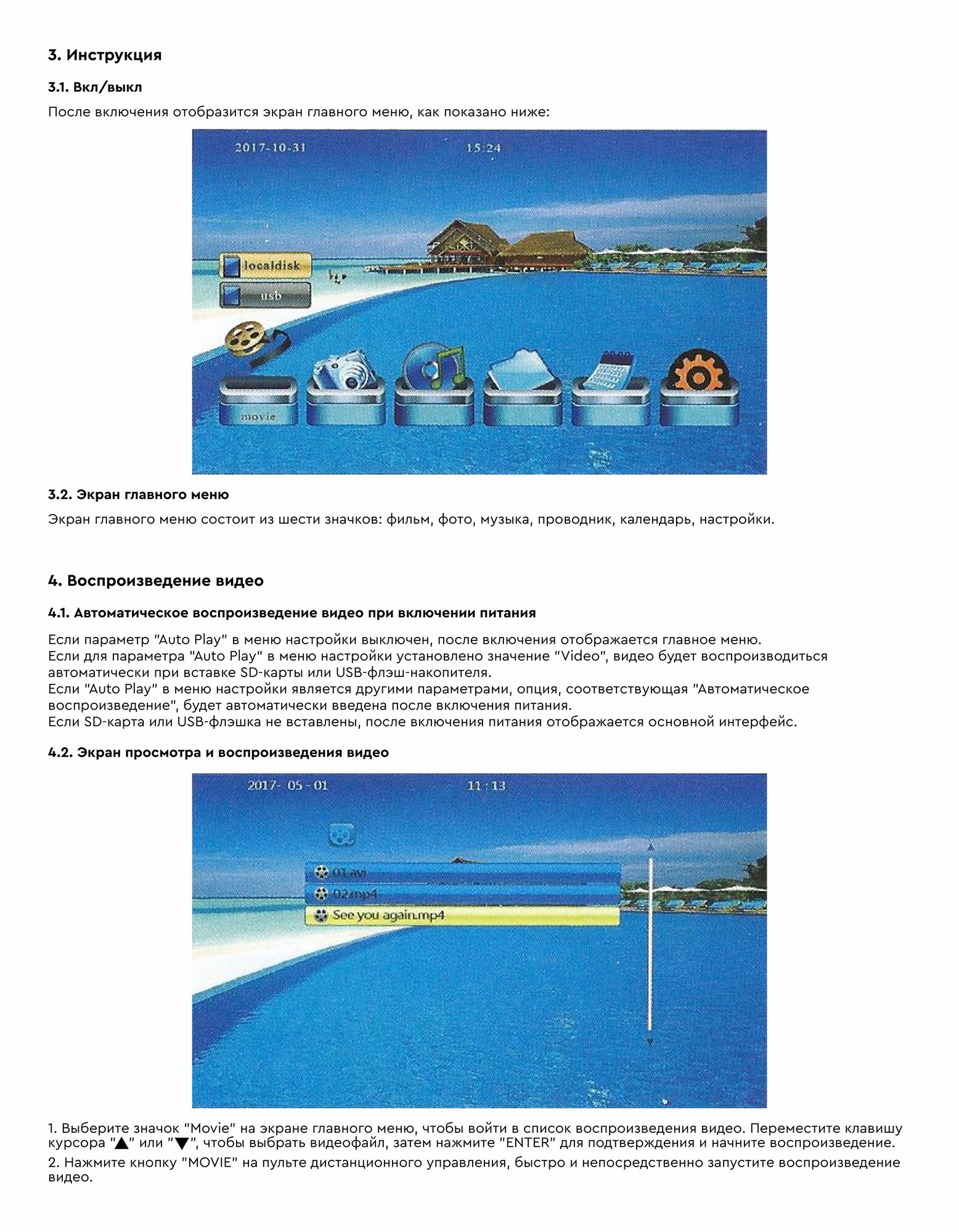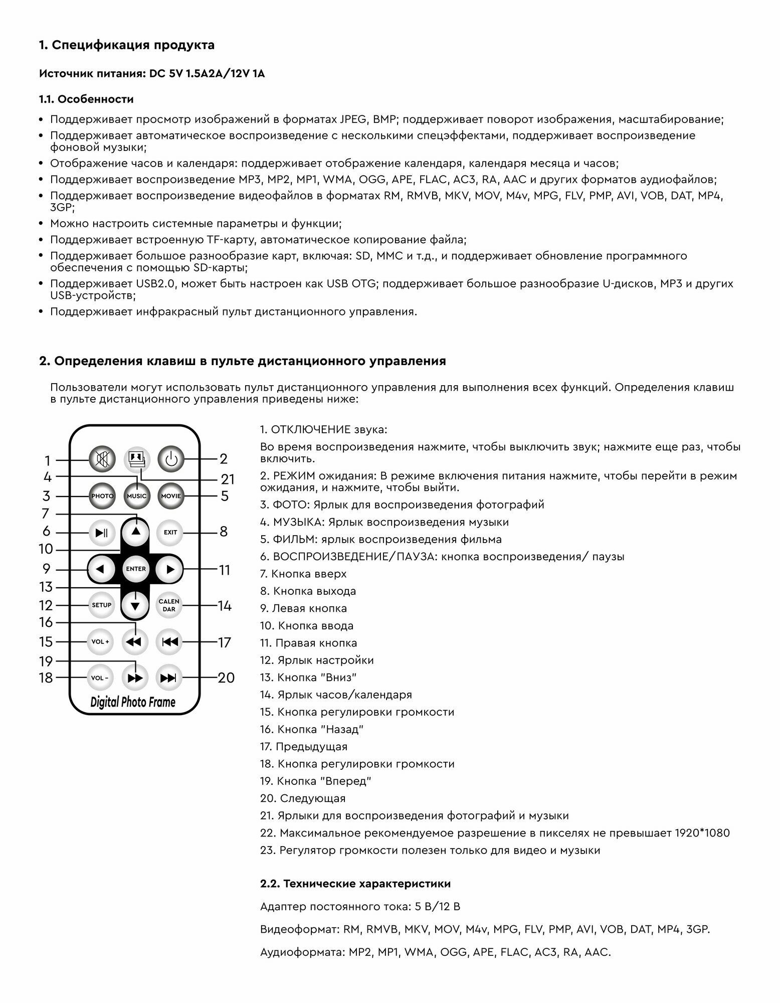 | Особенности | будильник, встроенный динамик, календарь, настенное крепление, проигрывание видео, пульт ДУ, с часами |
