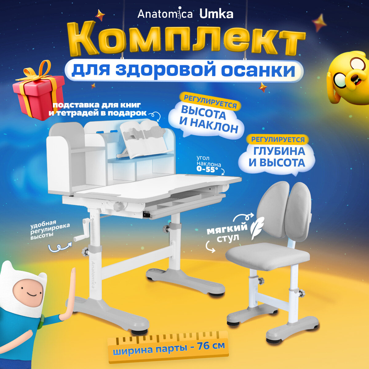 Комплект Anatomica Umka парта + стул + надстройка + выдвижной ящик + подставка для книг белый/серый интересное: