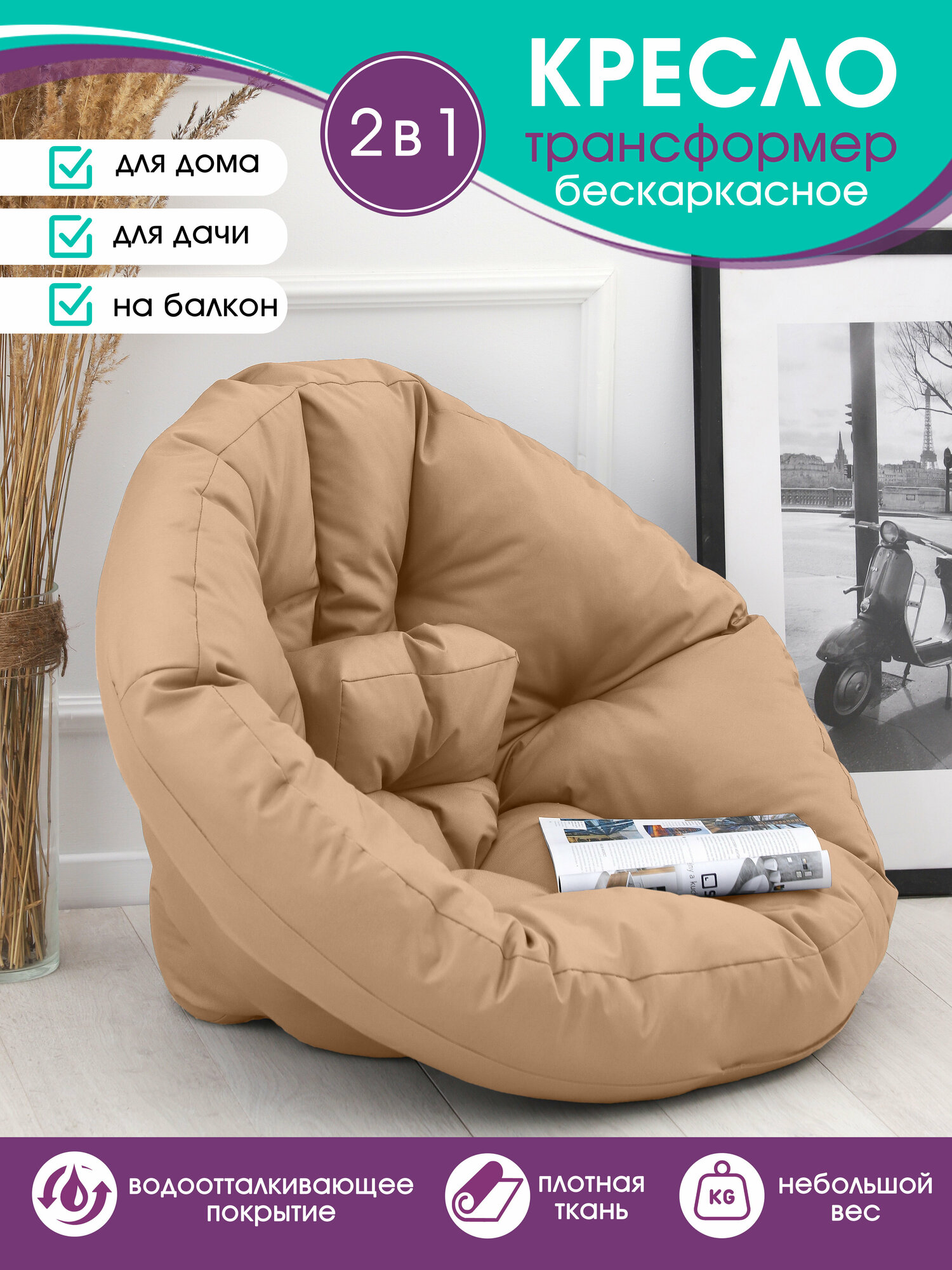 СохранитьКресло садовое бескаркасное,кресло футон, кресло мешок, кресло трансформер для дома, на балкон, для дачи водоотталкивающий ,беж интересное:
