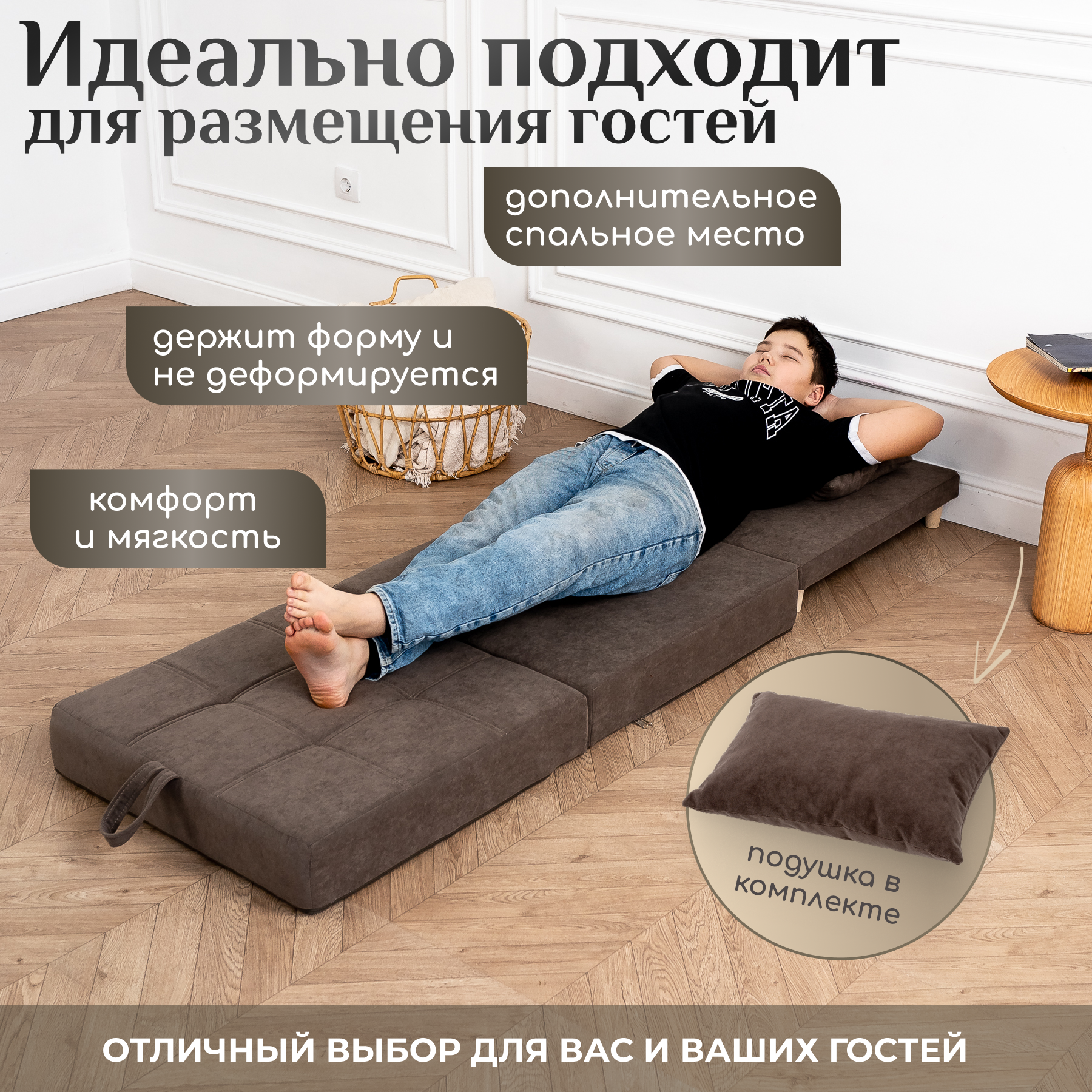 Пуф трансформер кровать раскладушка темно-коричневая рогожка с подушкой
