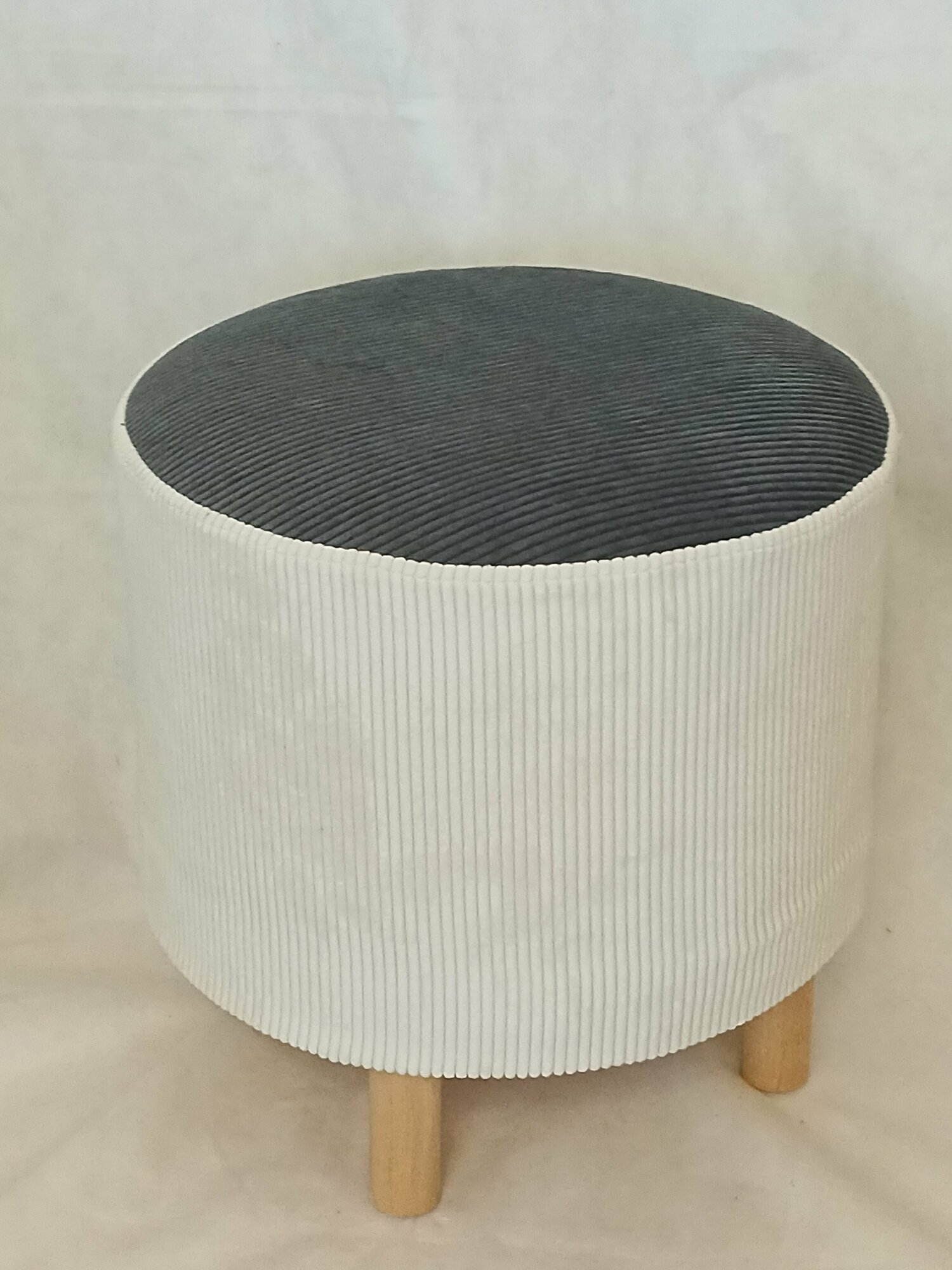 Пуфик, Пуф Круглый, в прихожую, вельвет верх- белый (сливочный), низ- темно-серый (графит) на деревянных ножках с подпятниками