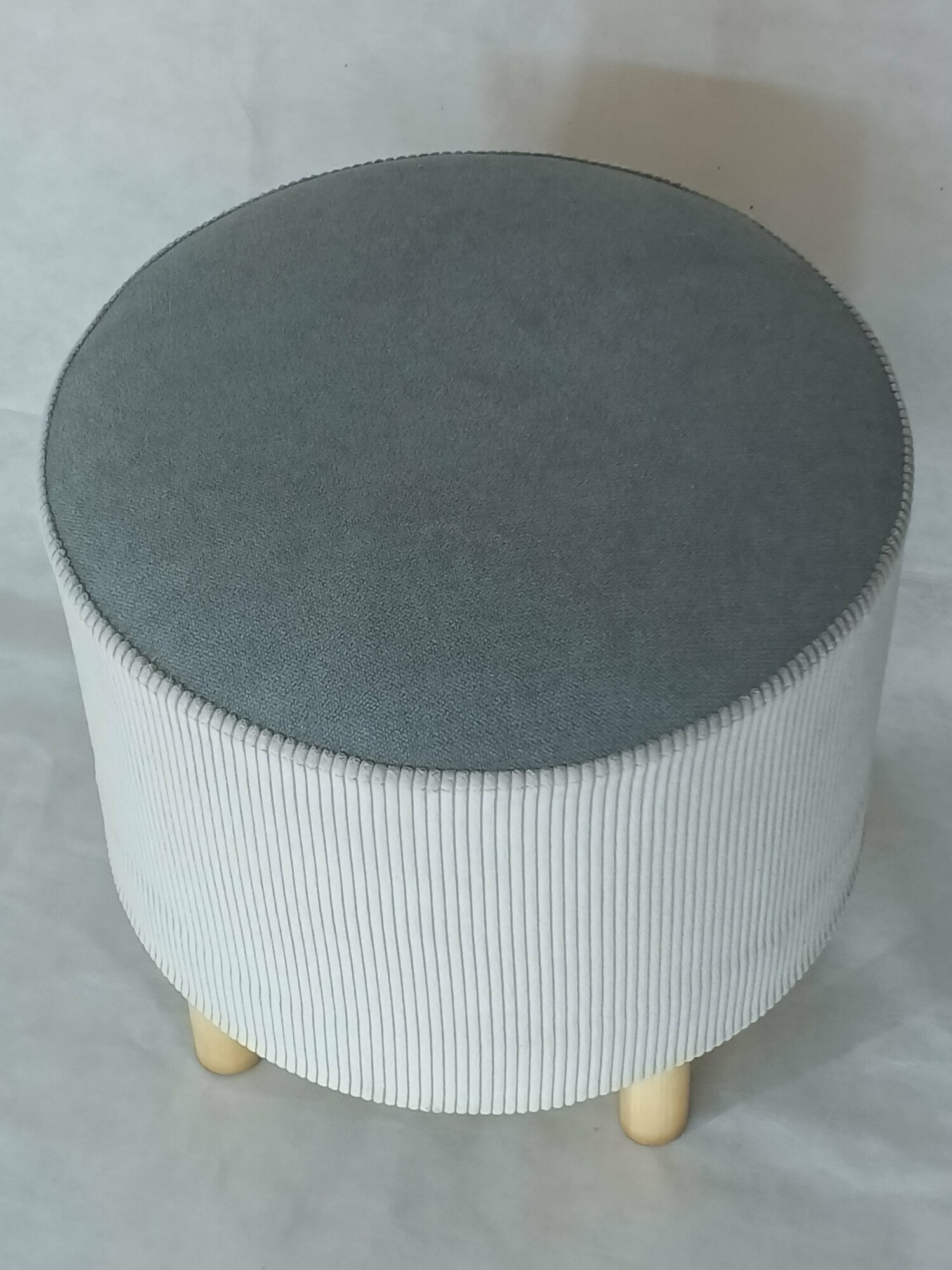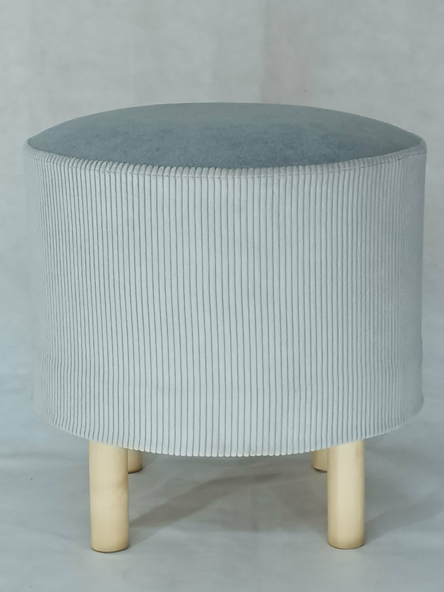 Пуфик, Пуф Круглый, в прихожую, верх- велюр антивандальный светло-серый (пепел), низ- вельвет белый (сливочный) на деревянных ножках с подпятниками