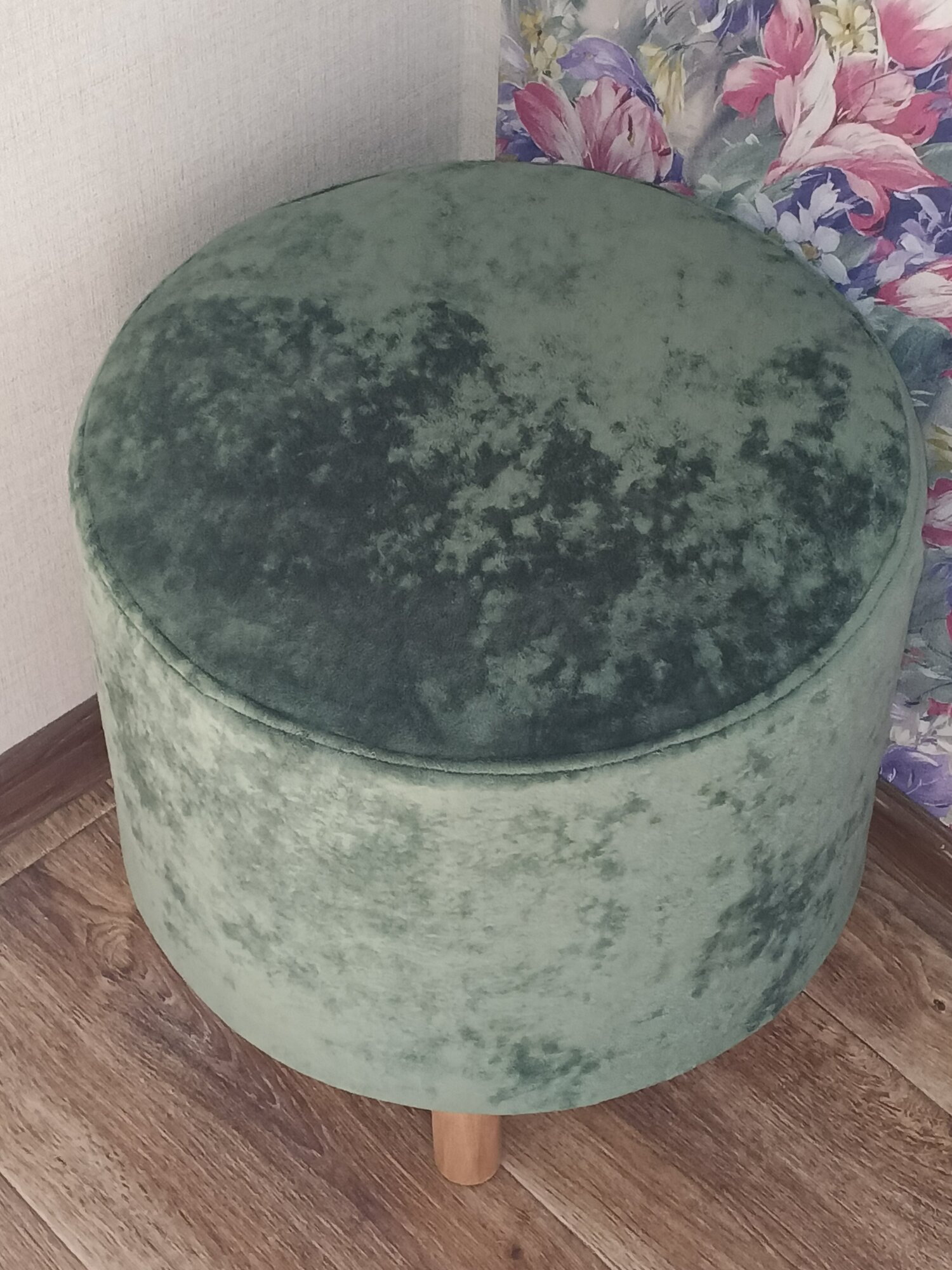 СохранитьПуфик, Пуф Круглый, в прихожую, велюр зелёный бархат цвет на деревянных ножках с войлочными подпятниками. интересное: