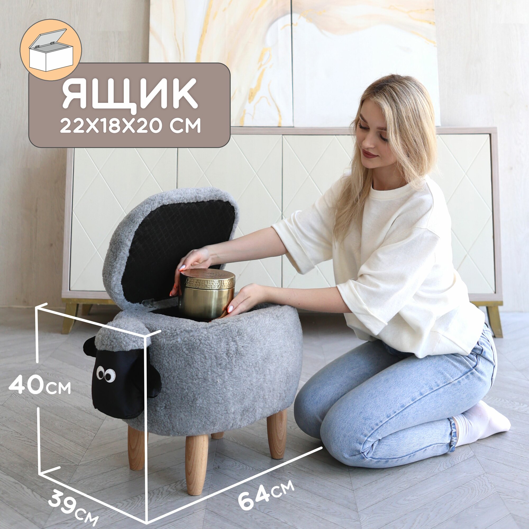 Пуфик с ящиком для хранения. Пуф-животное Черный Барашек