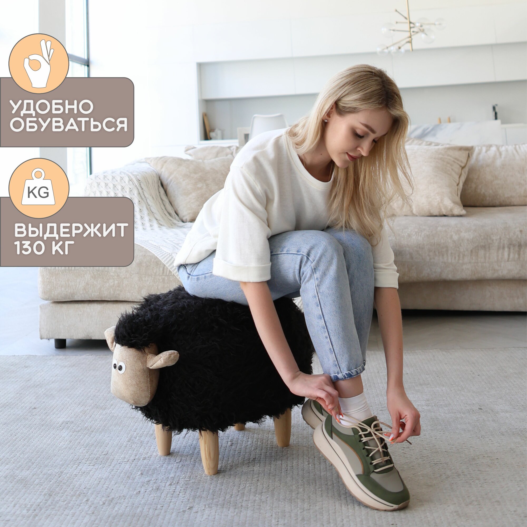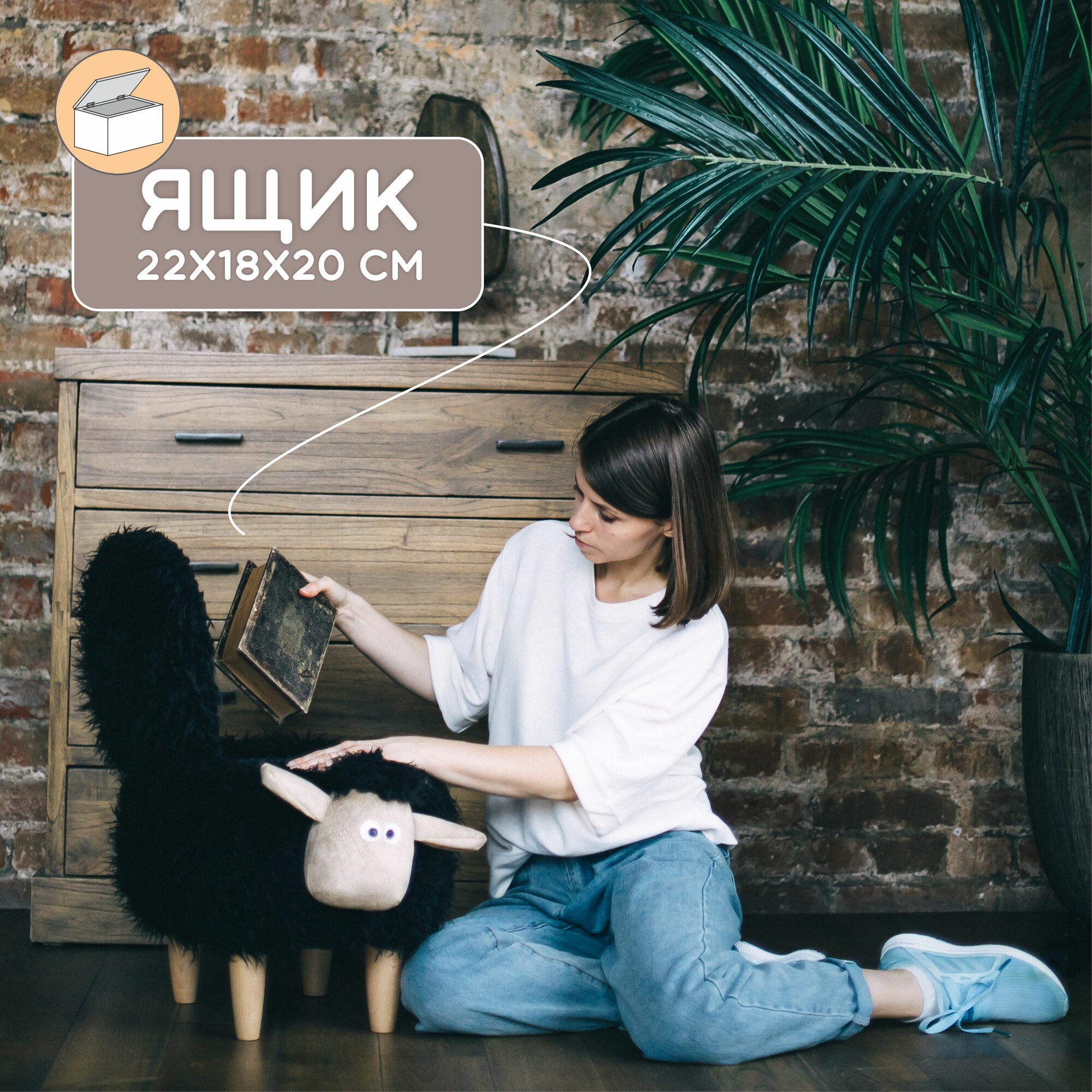 Пуфик с ящиком для хранения. Пуф-животное Черный Барашек интересное:
