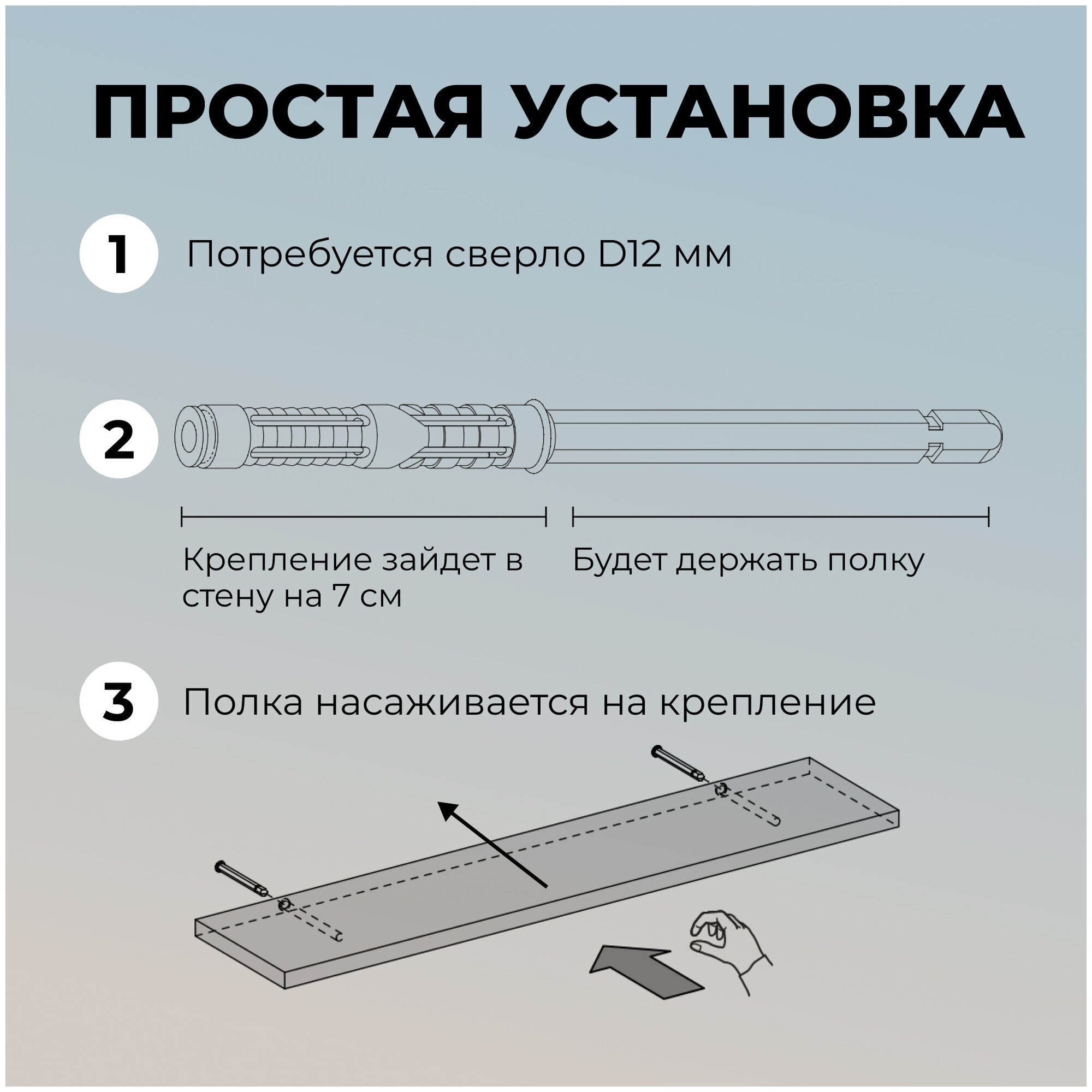 | Дополнительная информация | Парящая полка со скрытыми креплениями, монтаж возможен только на капитальные стены (кирпичные и бетонные) |