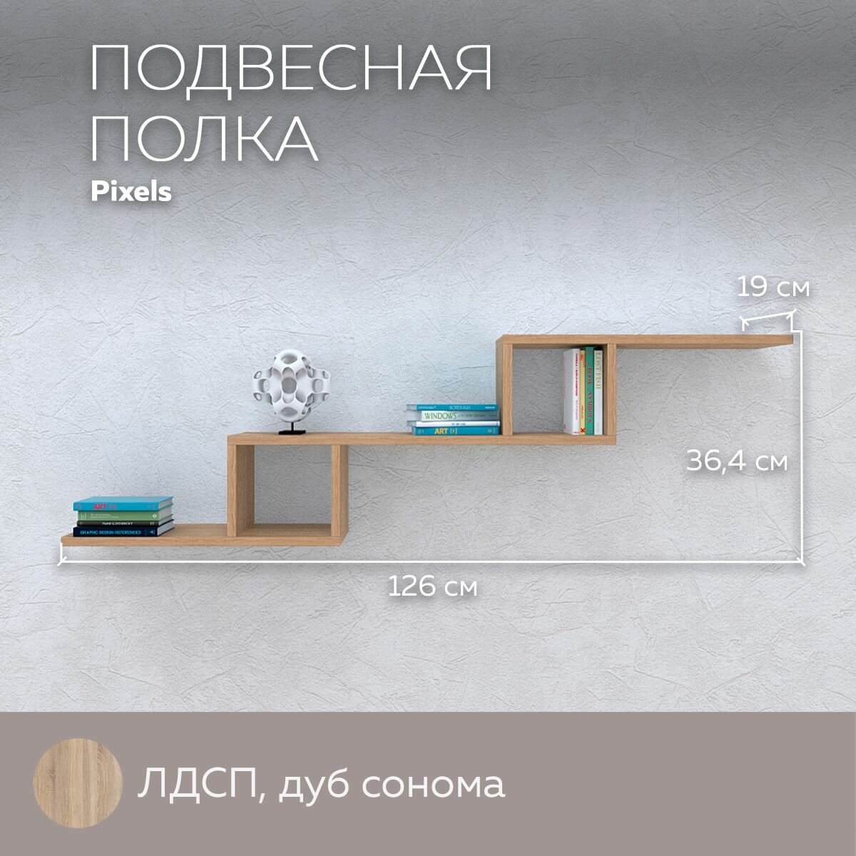 Полка навесная настенная Pixels для вещей, книг, игрушек, для дома и офиса, декор, лдсп, Дуб Сонома интересное:
