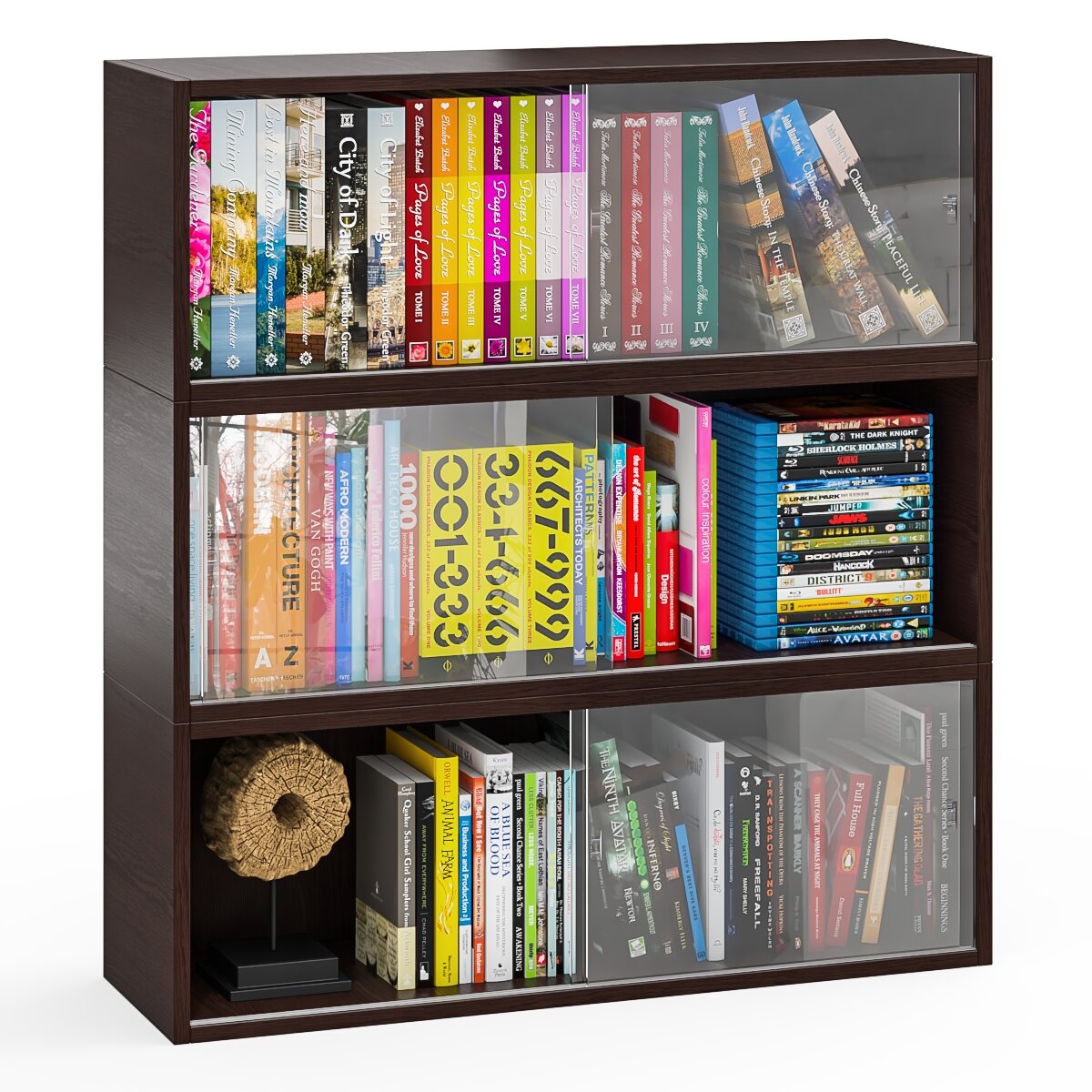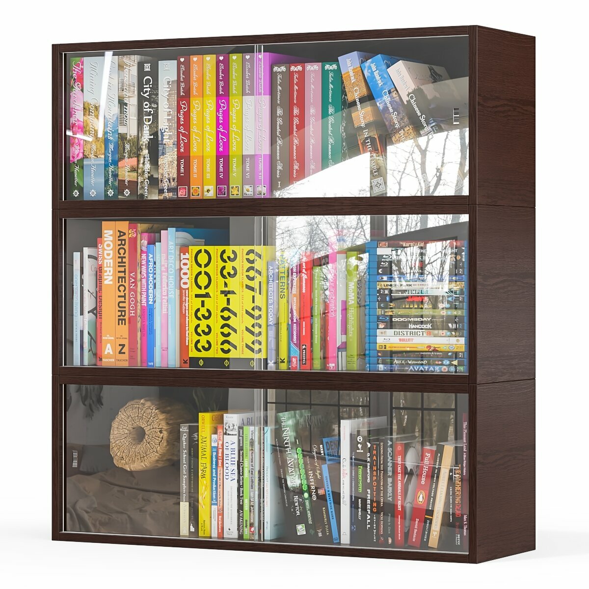 Три книжные полки Мебельный Двор КН1 со стеклянными сдвижными дверками цвет шимо тёмный