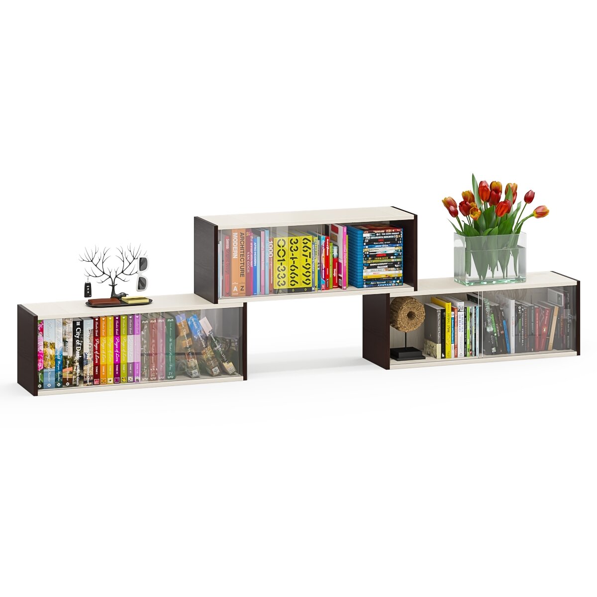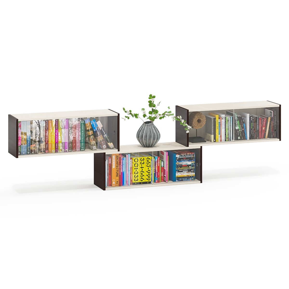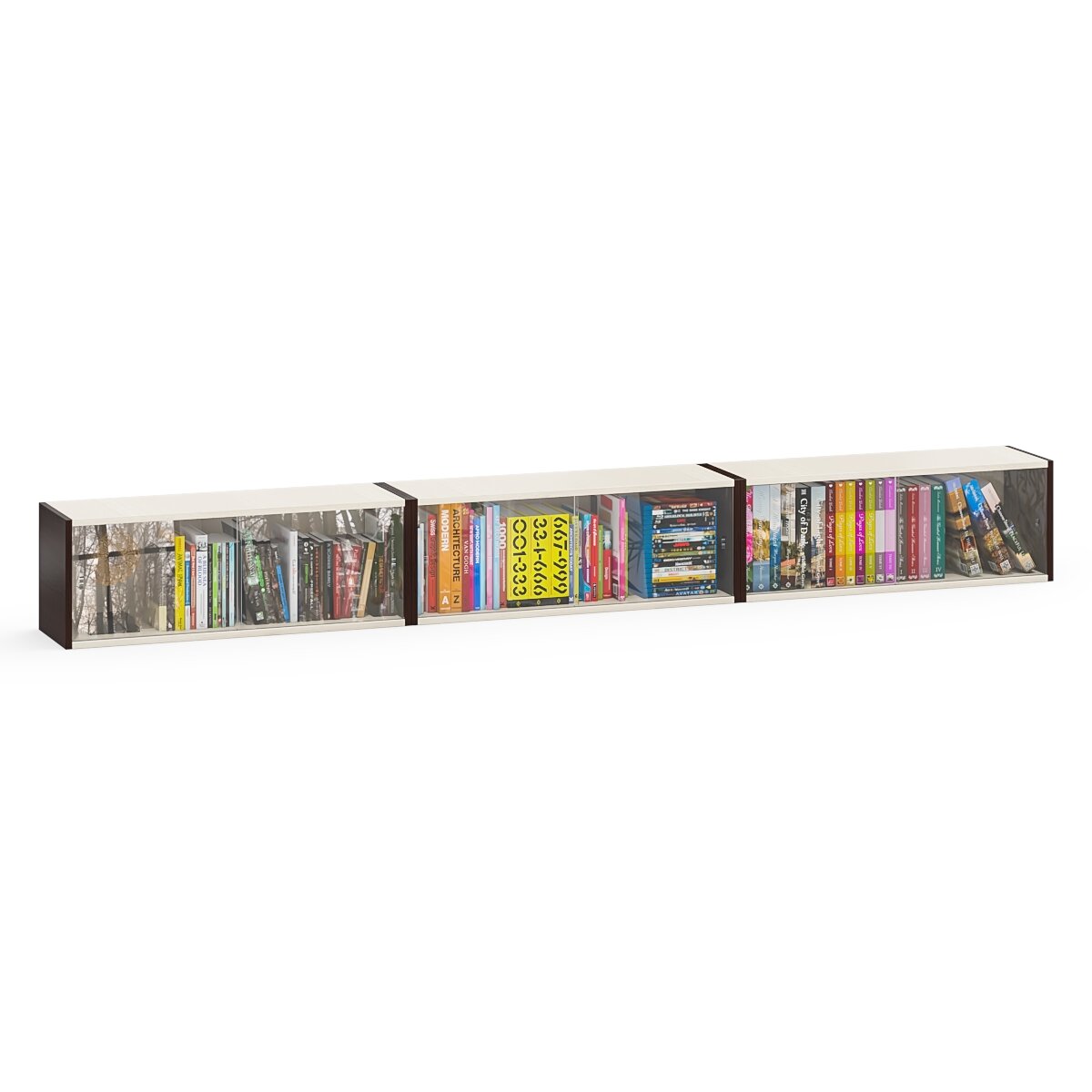 Купить Три книжные полки Мебельный Двор КН1 со стеклянными сдвижными дверками цвет венге/дуб