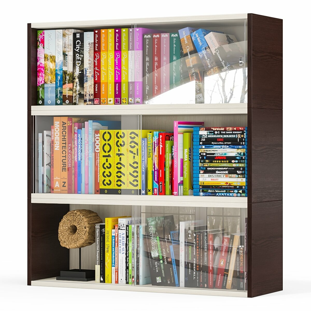 Три книжные полки Мебельный Двор КН1 со стеклянными сдвижными дверками цвет шимо тёмный