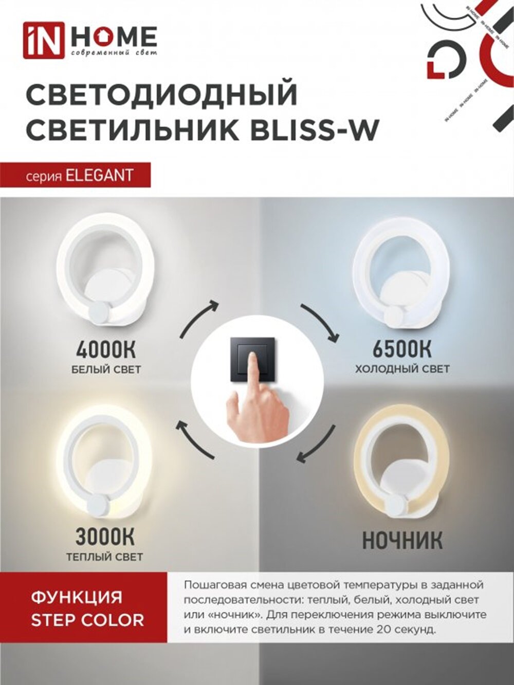 Купить Светильник потолочный светодиодный IN HOME ELEGANT BLISS-15W 15Вт 230В 3000-4000-6500K 1050Лм STEP COLOR белый