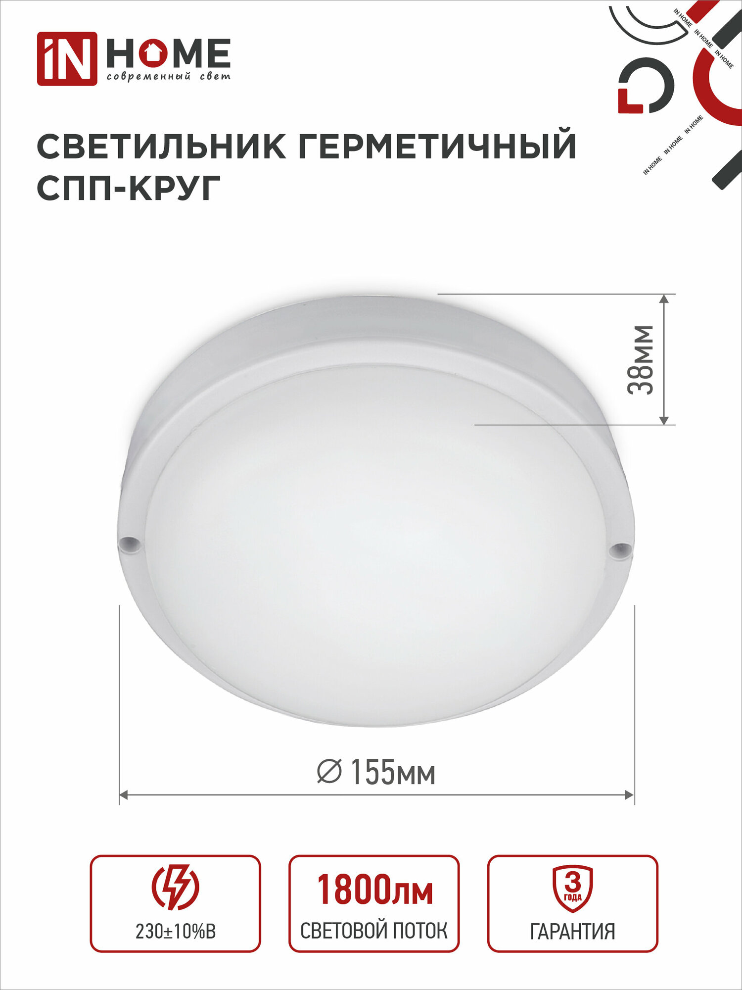 Светильник светодиодный герметичный СПП 2065-КРУГ 20Вт 6500К 1800лм IP65 155мм IN HOME 4690612044910 интересное: