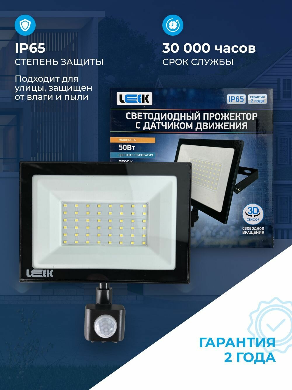 Прожектор светодиодный 30Вт с датчиком движения, IP65, для внутреннего и наружного освещения дворов, подьездов, охраняемых территорий, влагостойкий, LEEK