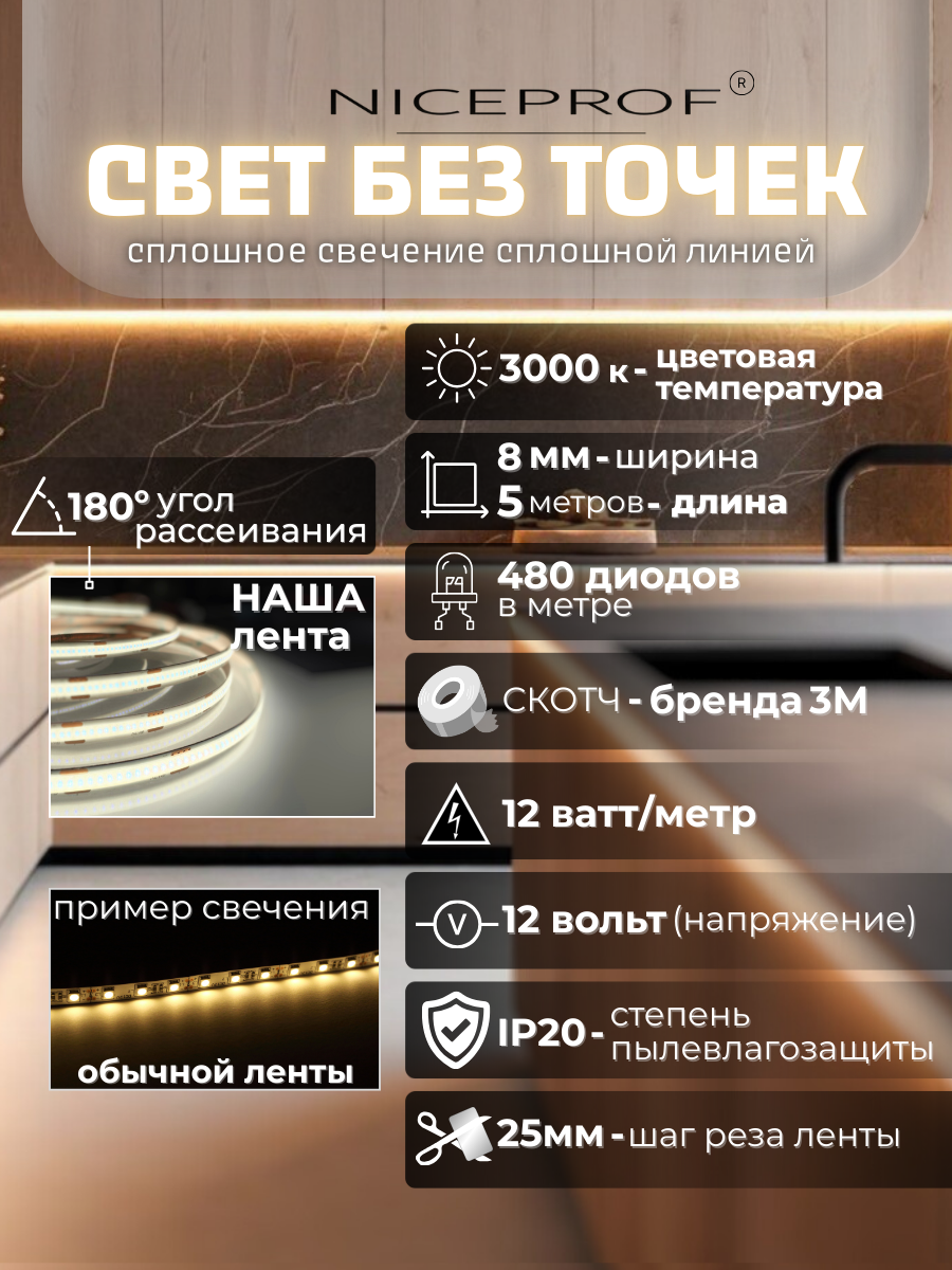 Светодиодная лента сплошного свечения Light-led, 5 метров, белый свет, COB, 3000K, 60Вт, 12В, IP20 интересное: