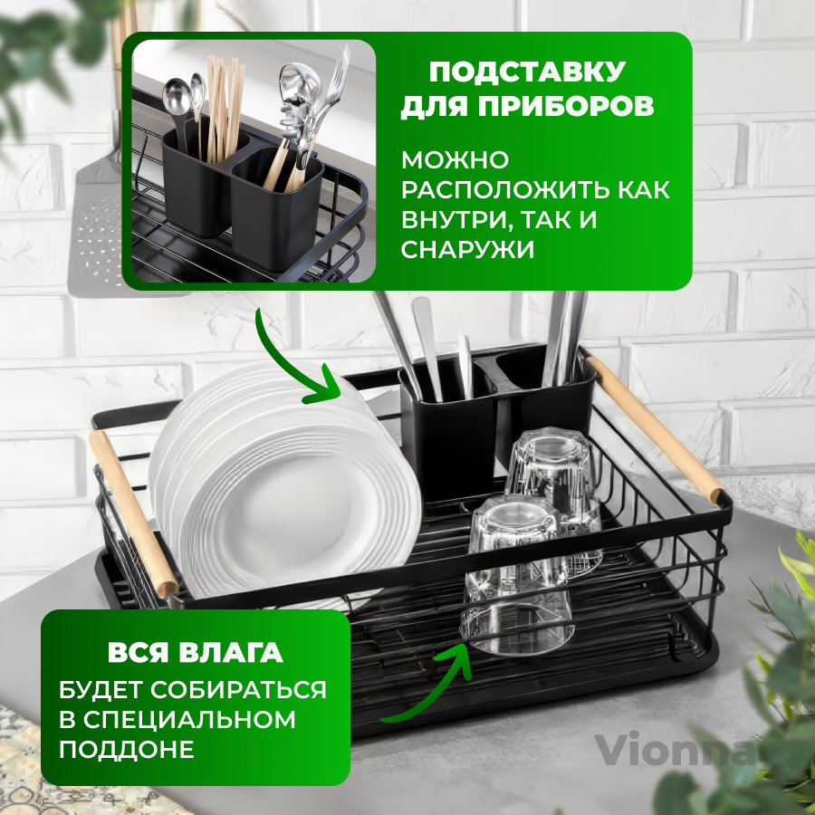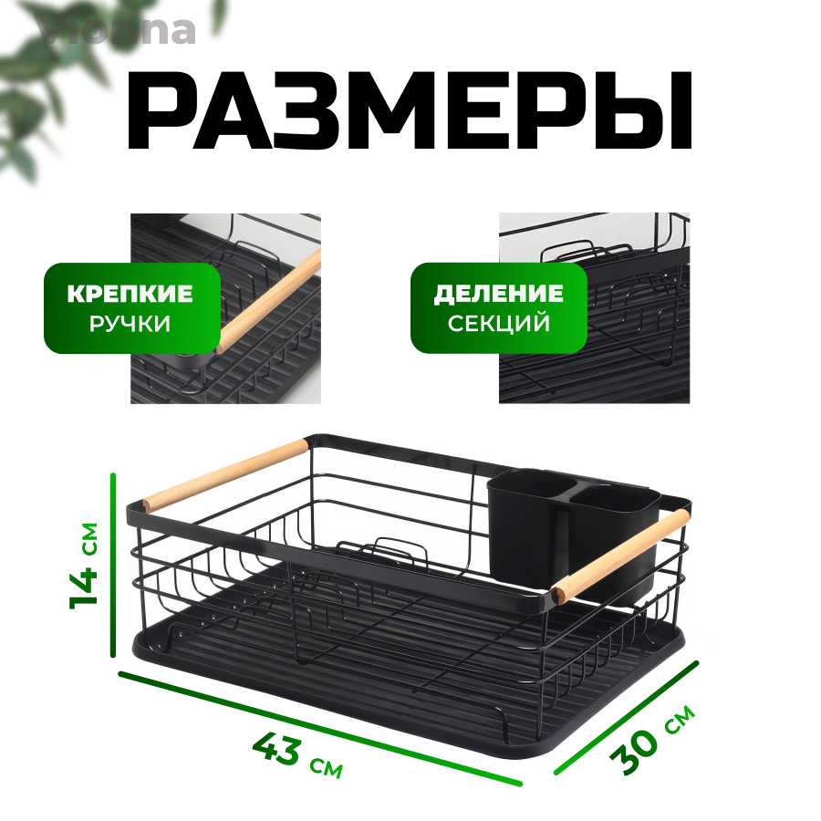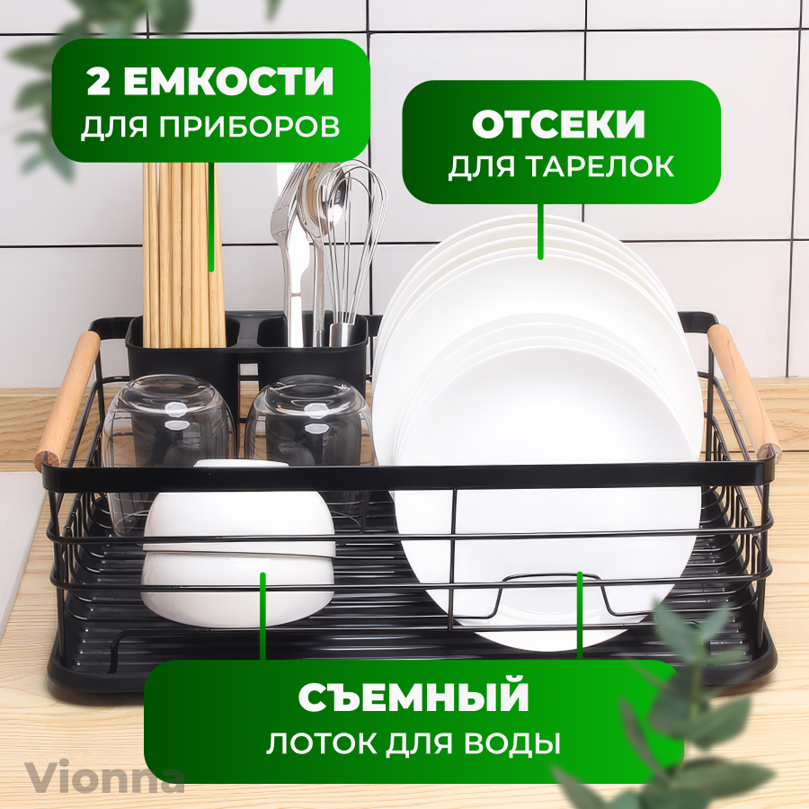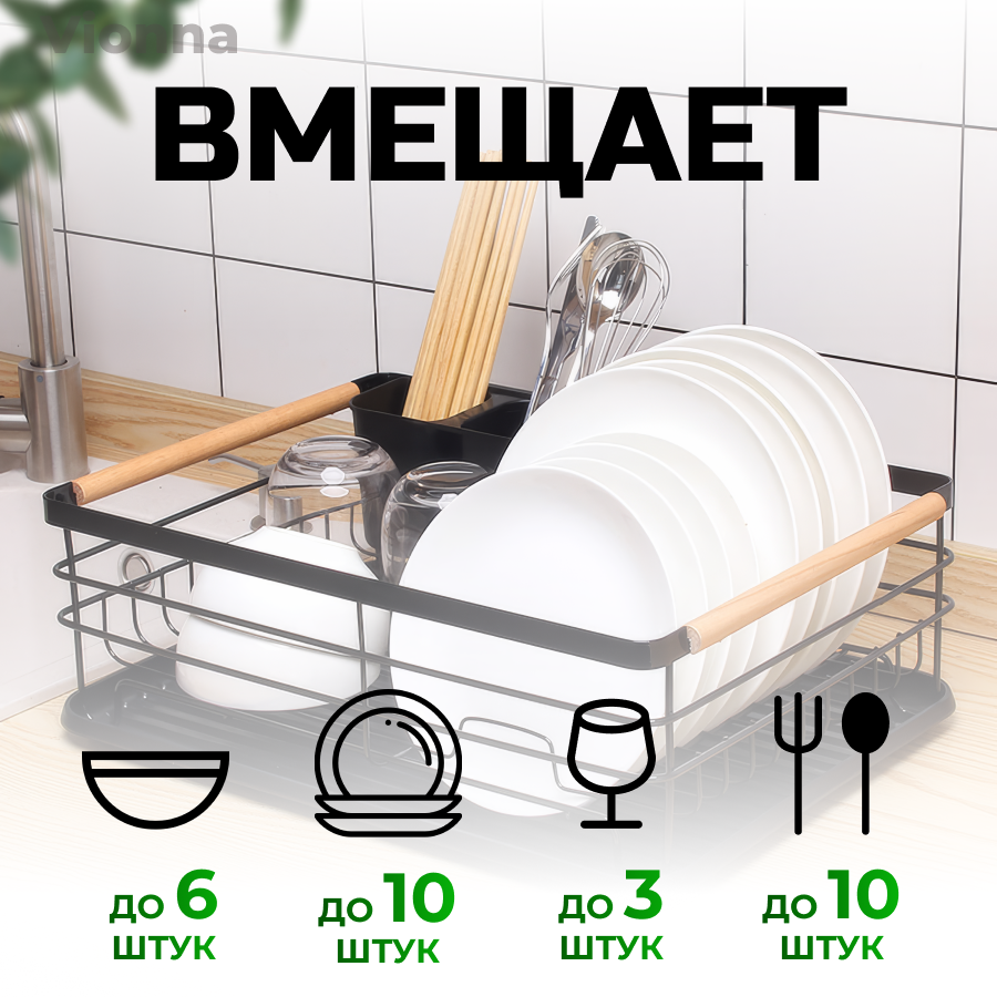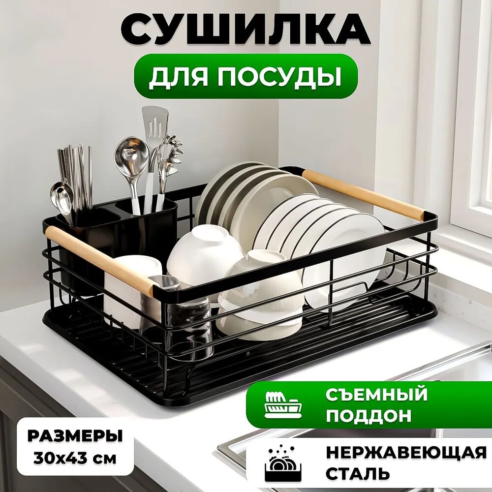 Сушилка для посуды черная настольная с поддоном из прочного пищевого пластика / Набор органайзера для сушки кухонных принадлежностей интересное: