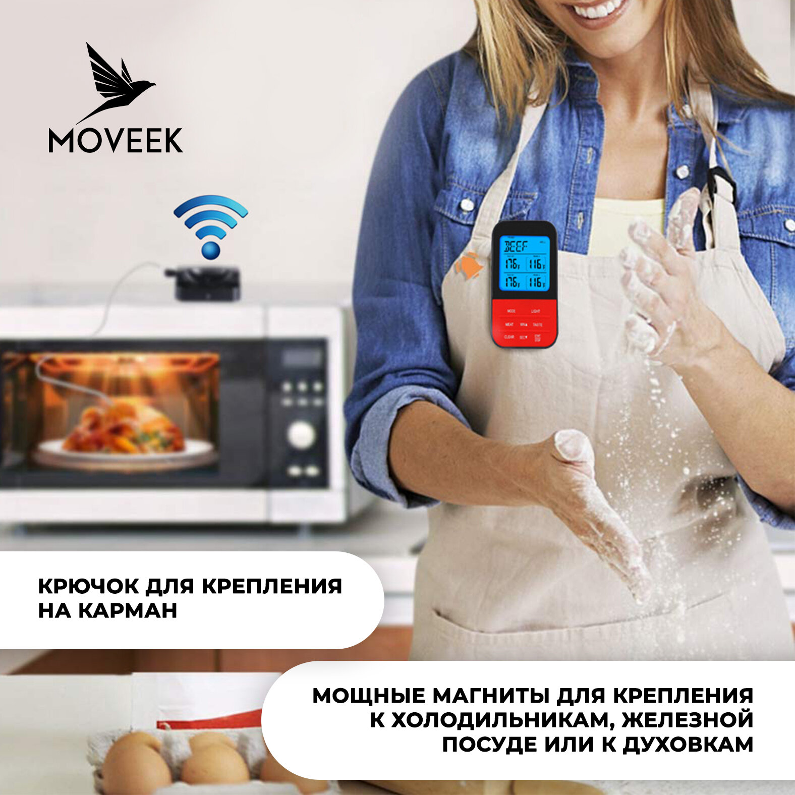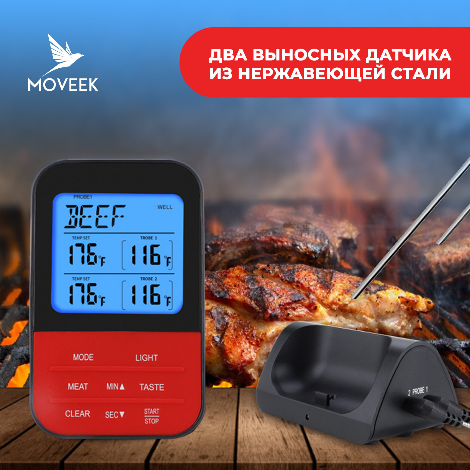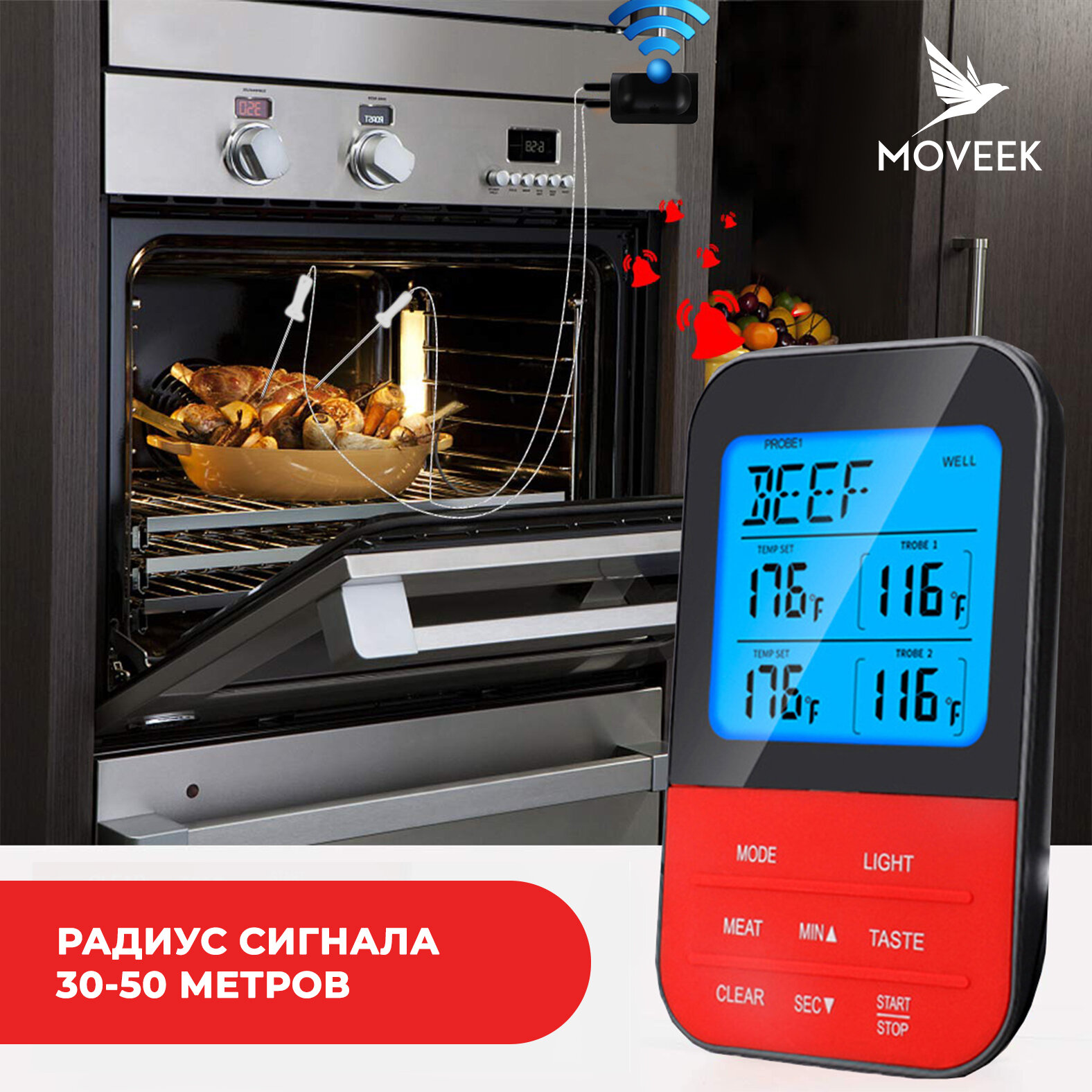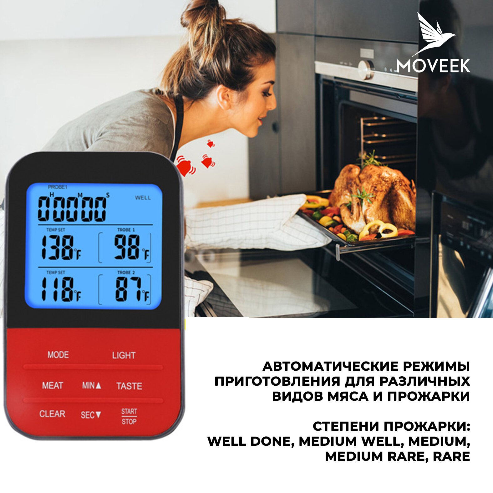 Беспроводной кулинарный термометр с двумя щупами, таймером и будильником для духовки, гриля и барбекю. интересное: