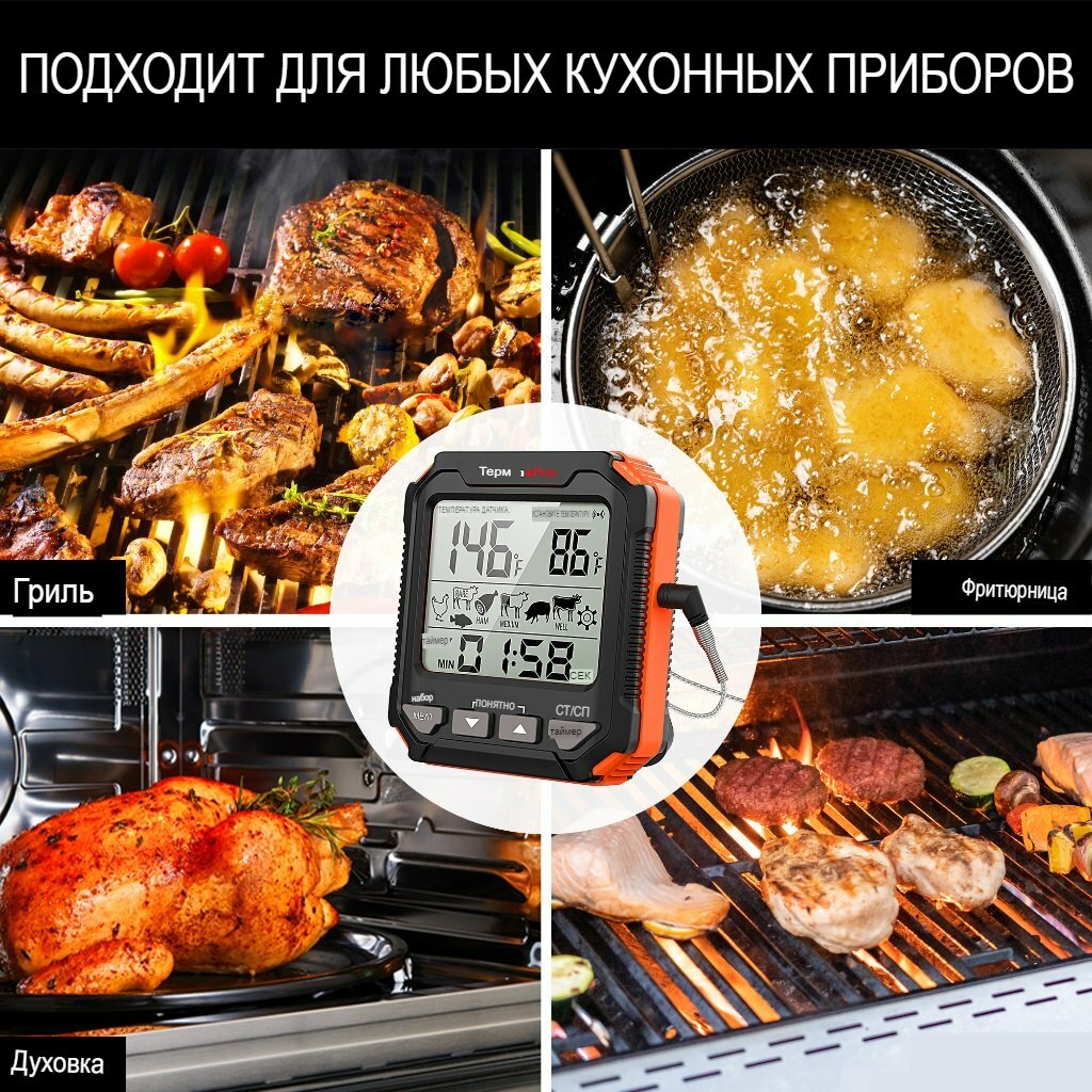 Кулинарный термометр электронный со щупом из нержавеющей стали, термометр для еды, мяса, вина, провод 1 метр / таймер кухонный