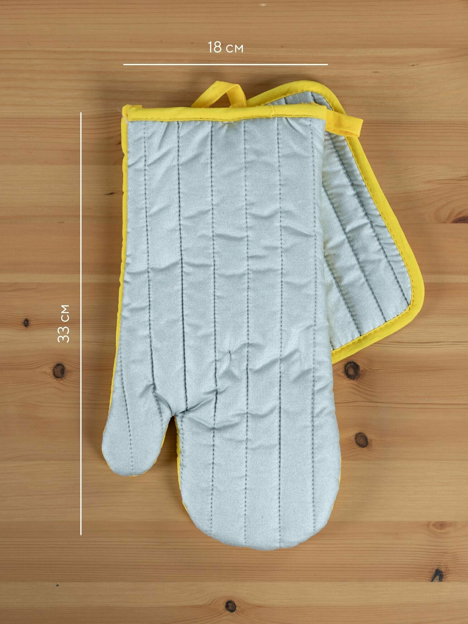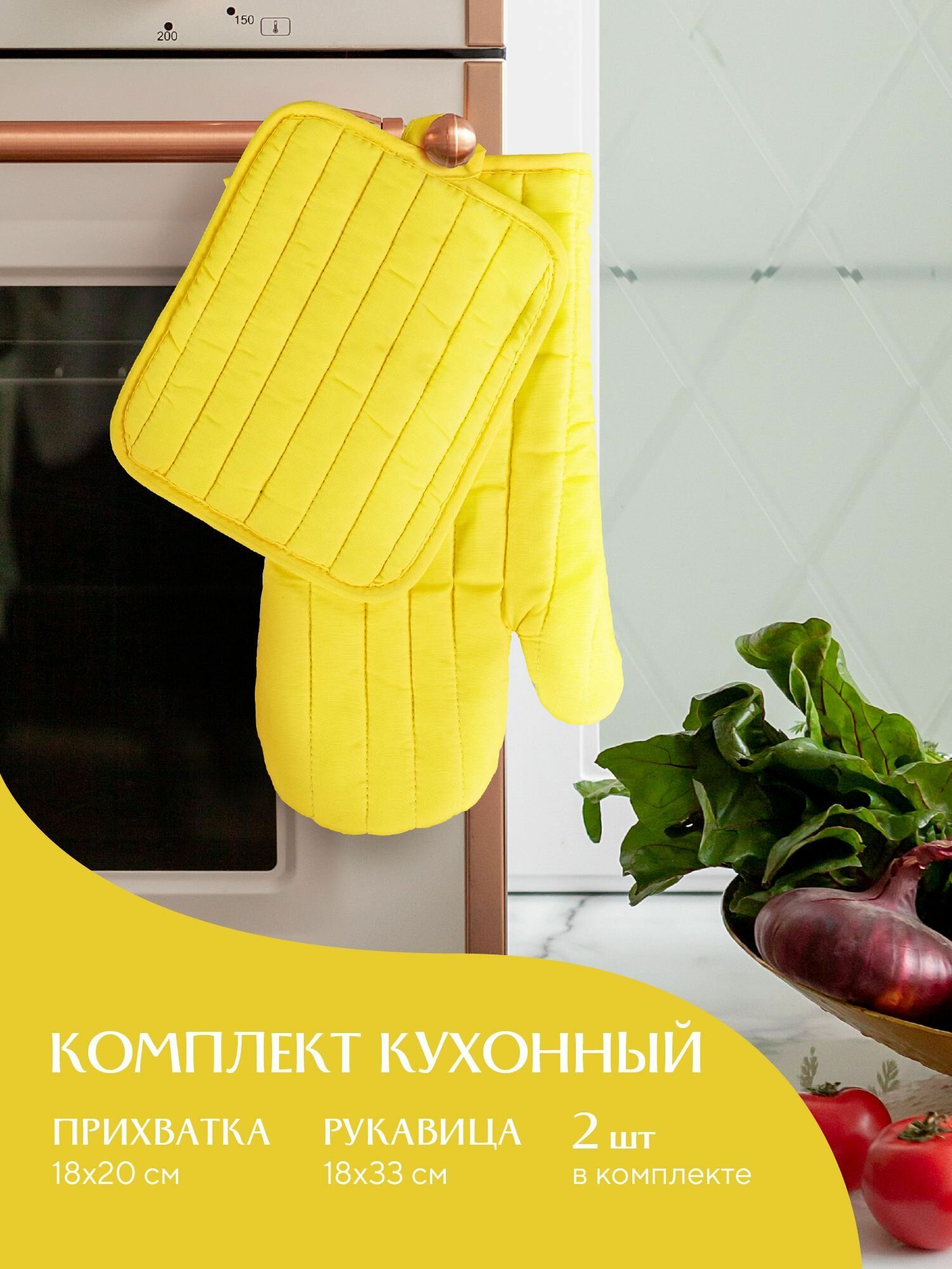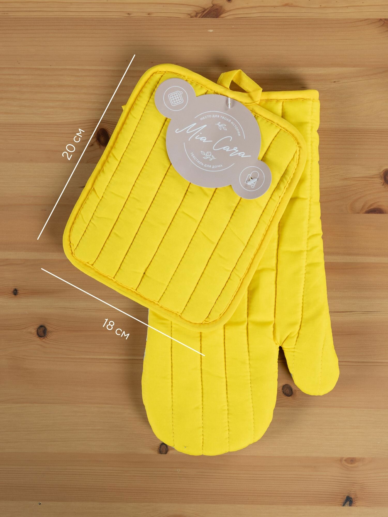 | Дополнительная информация | Кухонный набор (прихватка 18х20+рукавица 18х33) "Mia Cara" желтый (лицевая часть - 100% полиэстер, задняя часть 80% полиэстер, 20 % хлопок). |