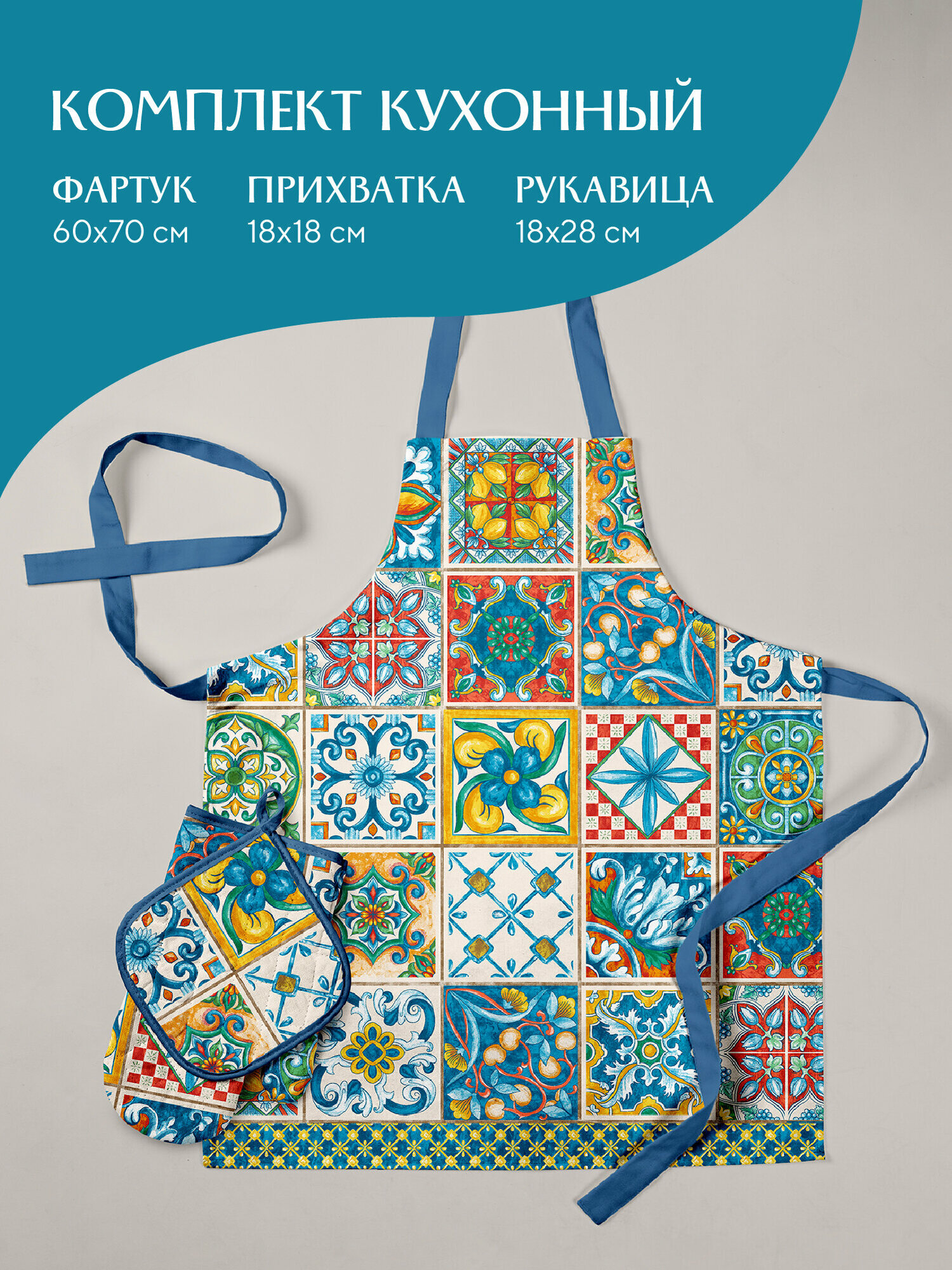 Купить Комплект кухонный рогожка (прихватка 18х18, прихватка-рукавица,18х28, фартук 60х70) "Mia Cara" рис 30548-1 Maiolica