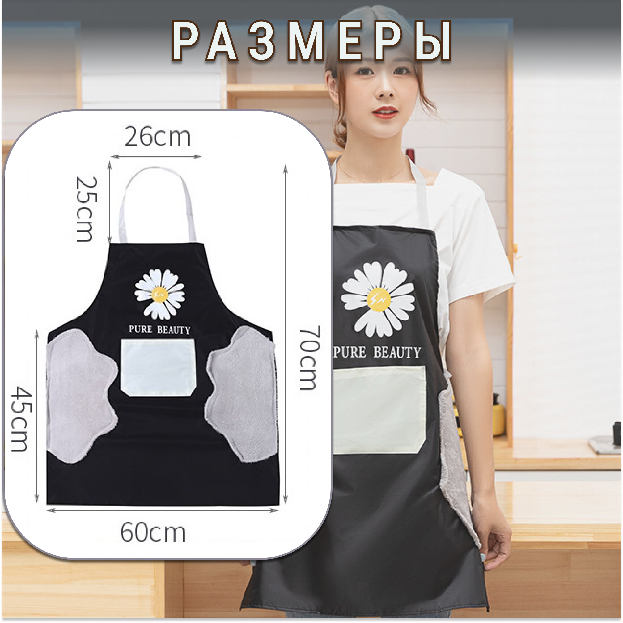 СохранитьФартук кухонный универсальный, рабочий, со вставками для вытирания рук. С принтом "Цветок". Цвет черный с бежевым карманом. интересное: