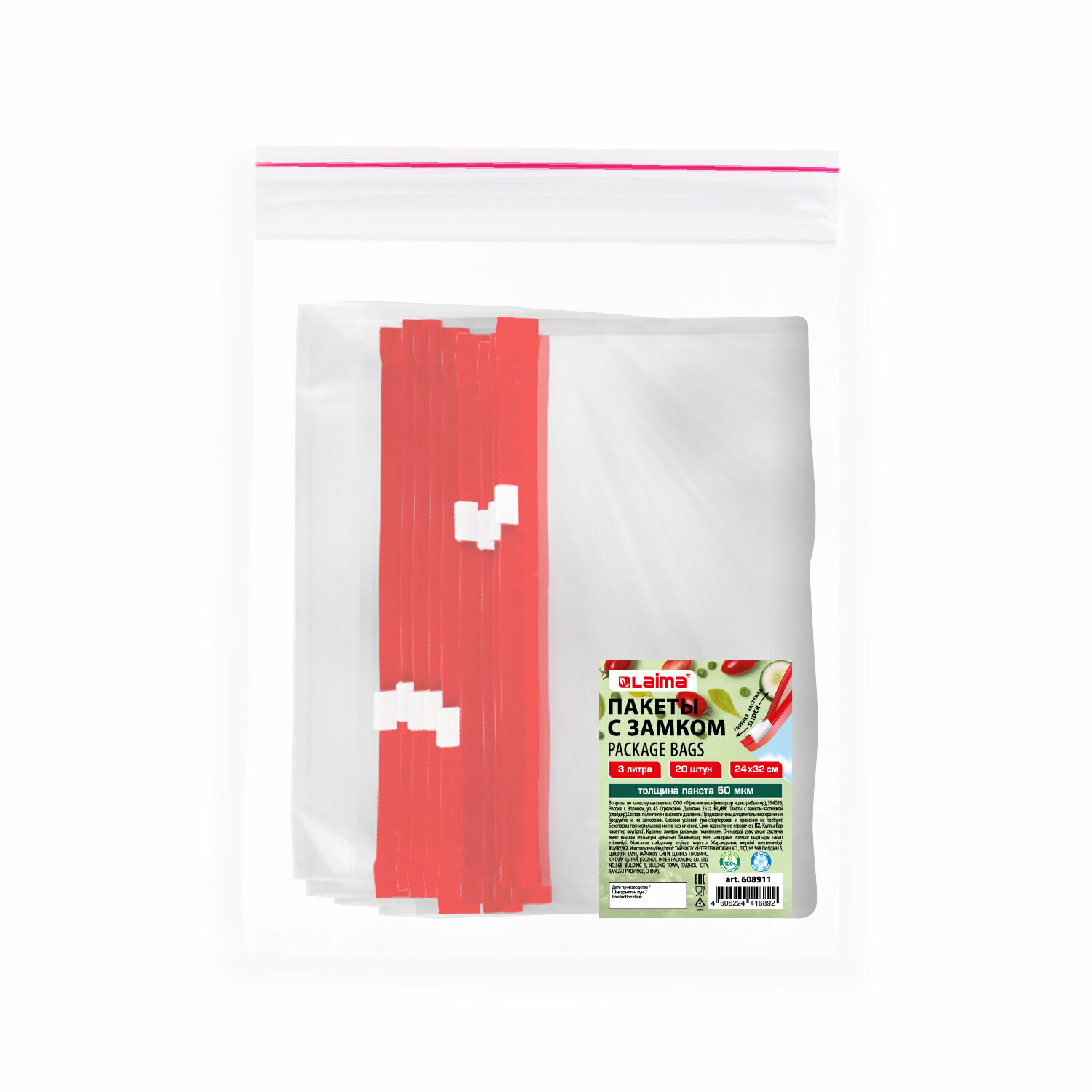 | Комплектация | Пакеты для заморозки продуктов, 3 л, КОМПЛЕКТ 20 шт., с замком-застежкой (слайдер), LAIMA |