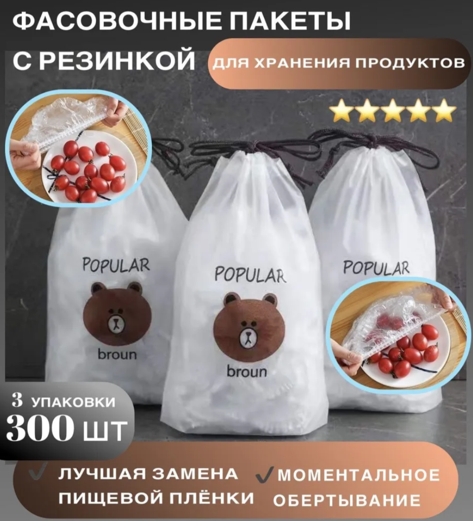 Пакеты шапочка POPULAR BROUN для хранения продуктов, 300 шт. диаметр до 24 см. интересное: