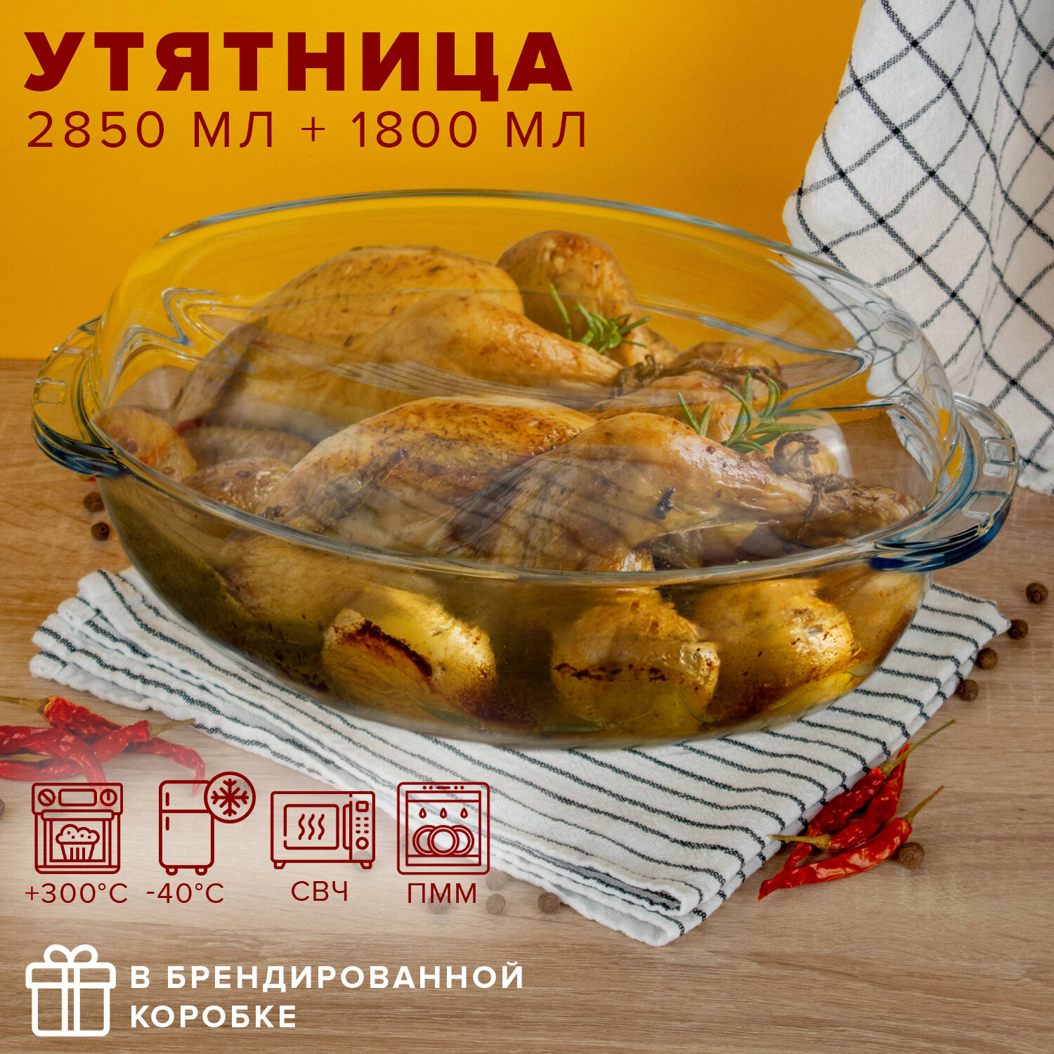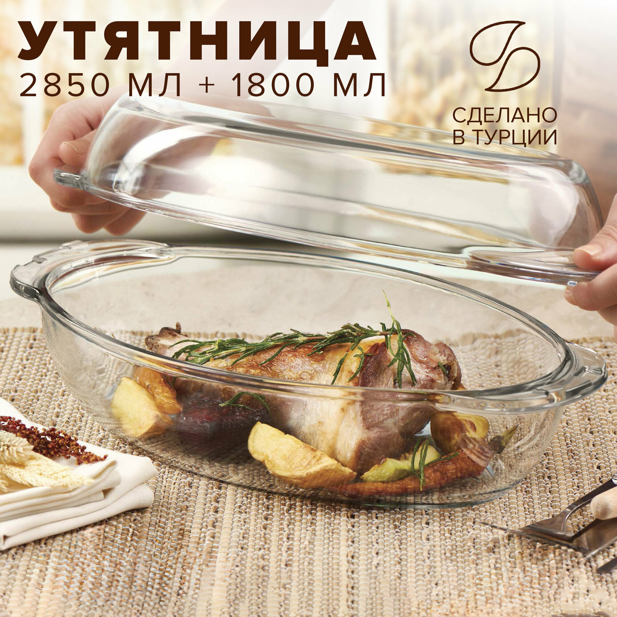 | Дополнительная информация | стеклянная жаропрочная утятница с крышкой; сысота меньшей половинки 5,5 см (объем 1800 мл), высота большей - 9 см (объем 2850 мл) |