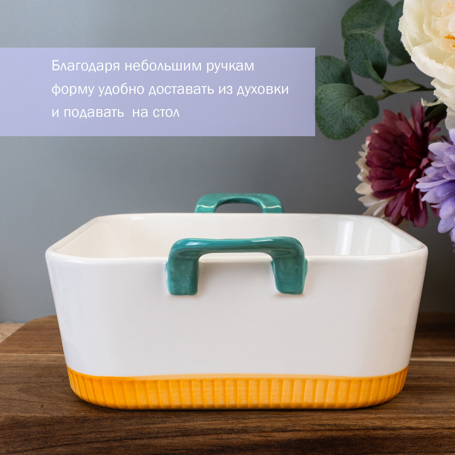 Квадратное блюдо "Инари" 25х21х6см для запекания фарфоровое с силиконывими ручками. Подарочная упаковка. Lenardi