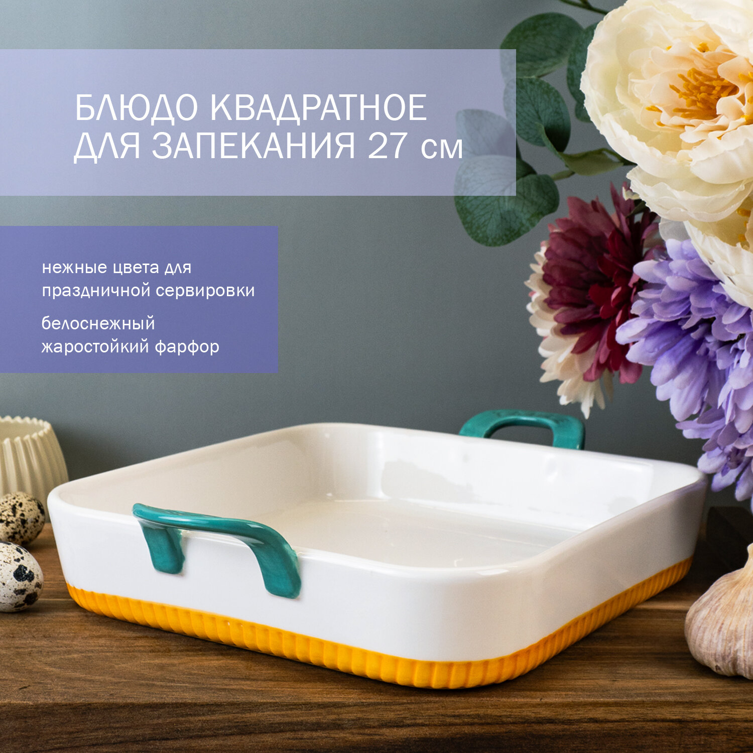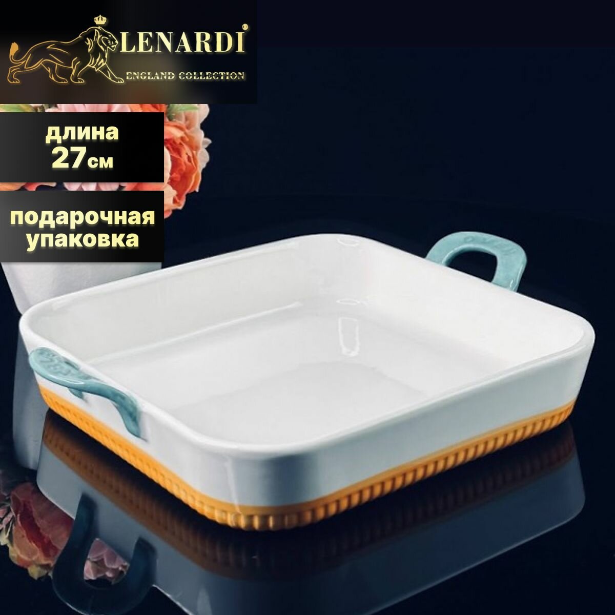 Форма для выпечки, Блюдо для запекания квадратное 27 см с ручками "Шарлотта". Lenardi. Фарфор. Подарочная упаковка.