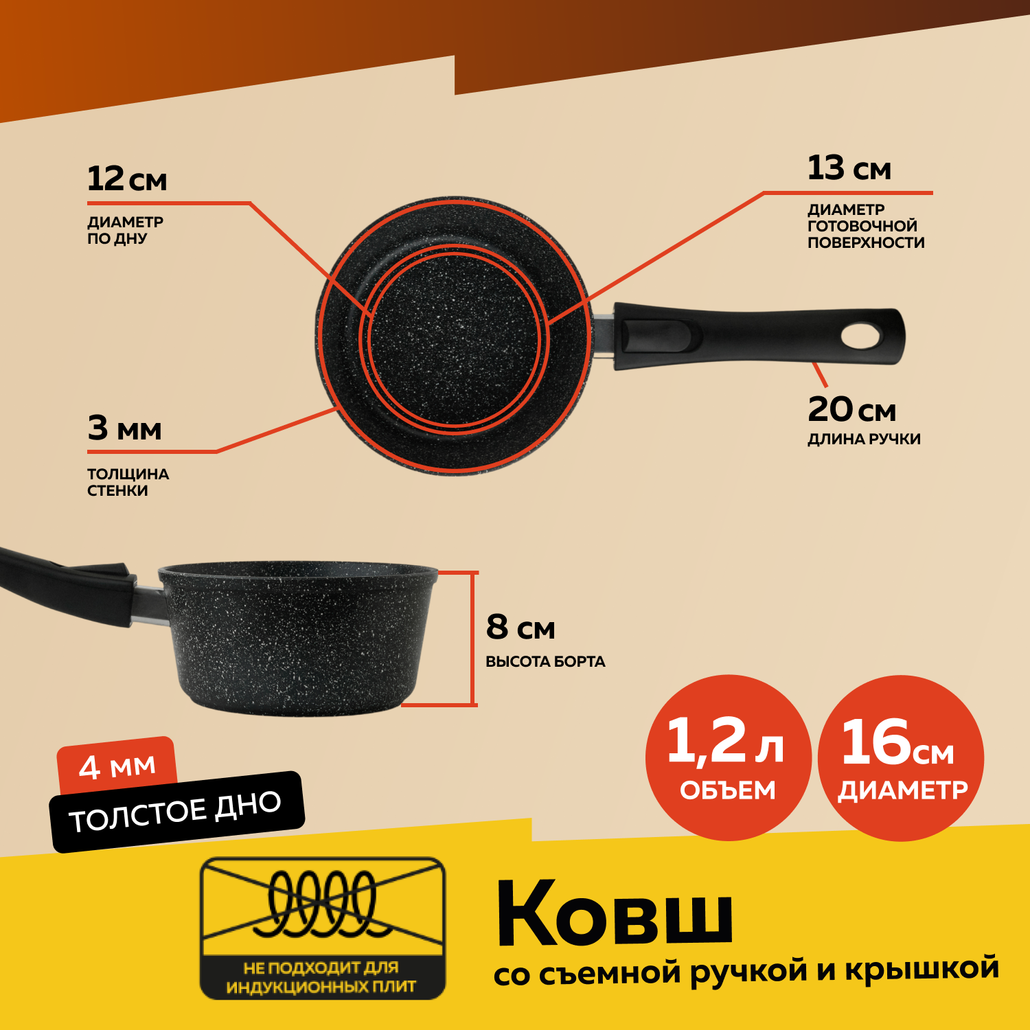 Ковш с крышкой ALWA с антипригарным покрытием и съемной ручкой, объем 1,2 литра