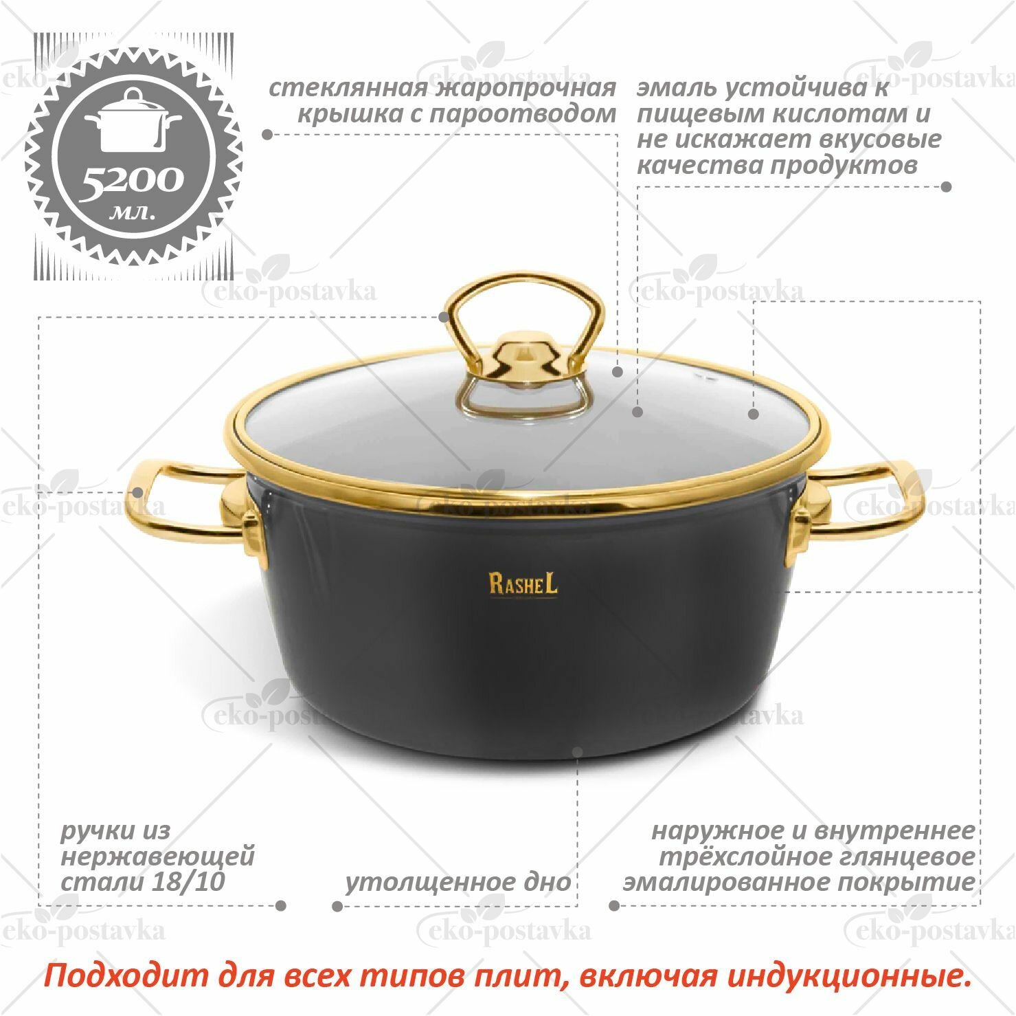 СохранитьКастрюля эмалированная 5,2 литра Rashel с крышкой 26 см с элементами "под золото" Графитовый интересное: