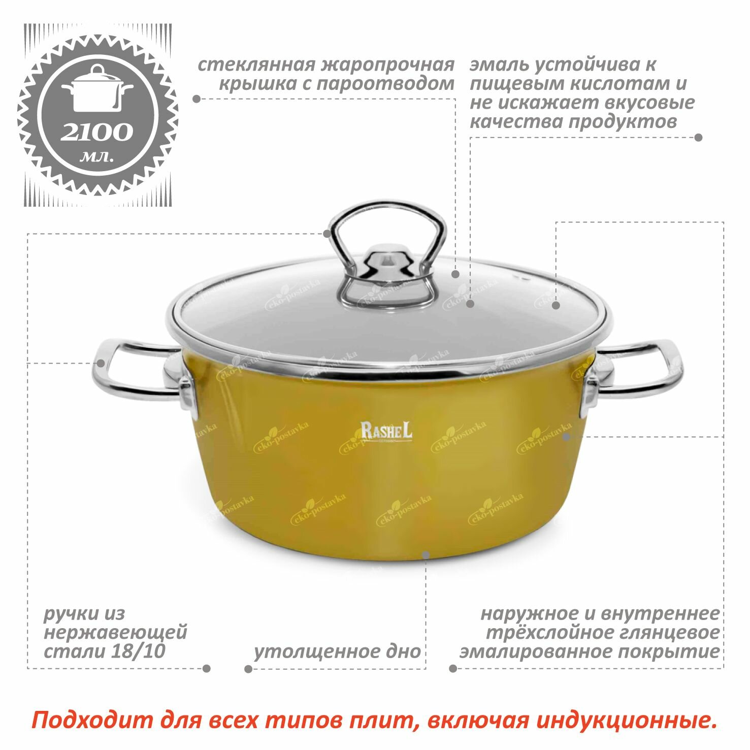 Кастрюля эмалированная 2,1 л с крышкой 18 см Rashel для газовых, электрических и индукционных плит, эмаль, посуда для индукции эмалированная сталь