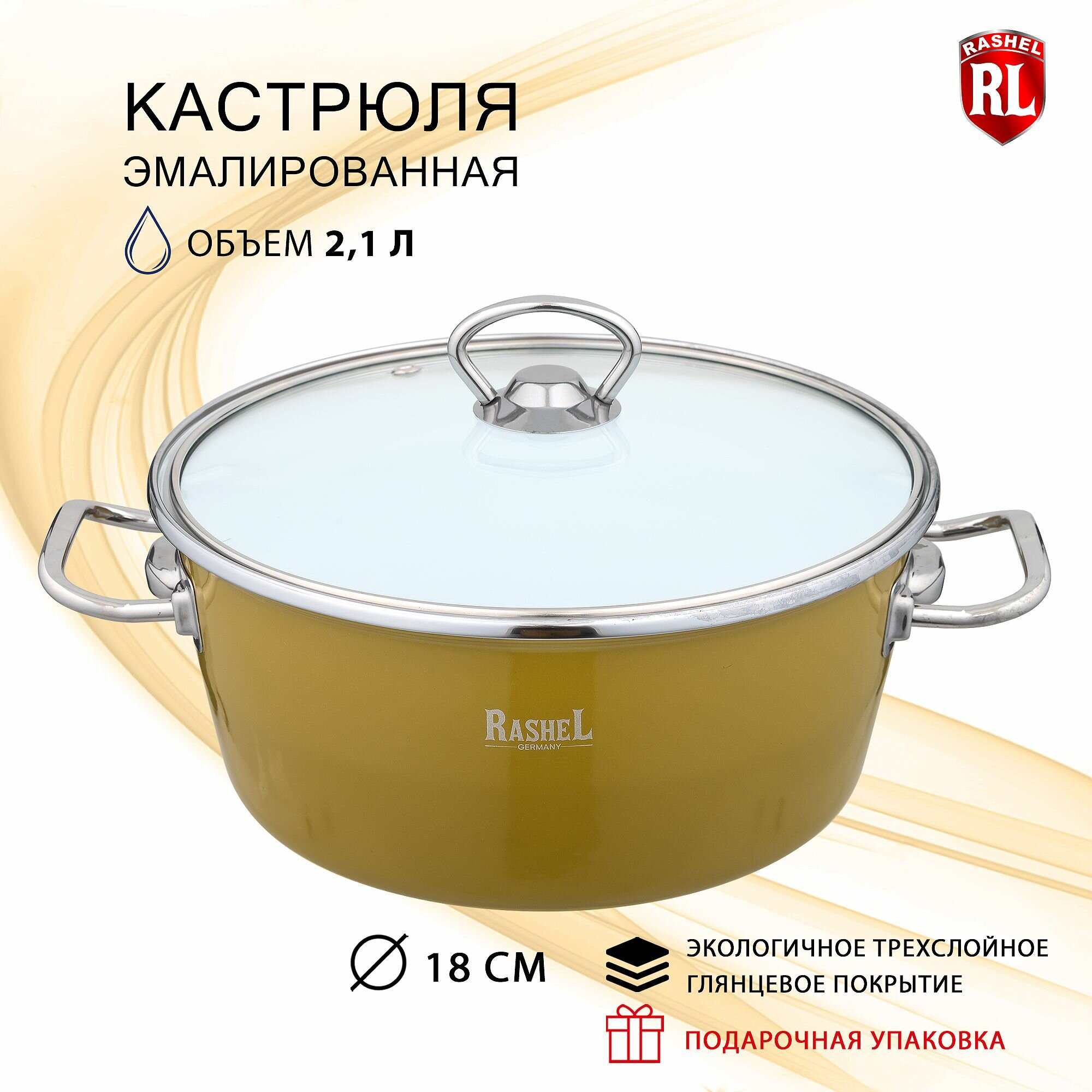 Кастрюля эмалированная с стеклянной термостойкой крышкой с паровыпуском RasheL 2,1 л