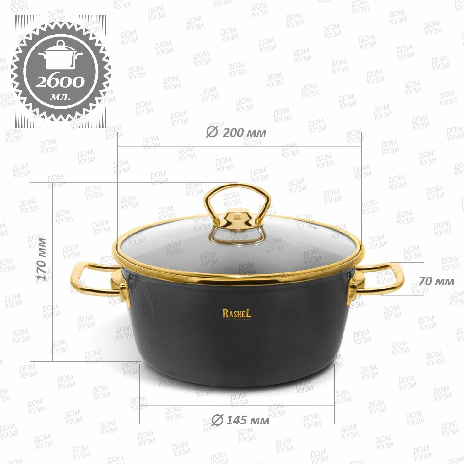 Кастрюля Rashel Grand R0820 2,6л эмаль, ст.крышка, ручка золото; графитовый