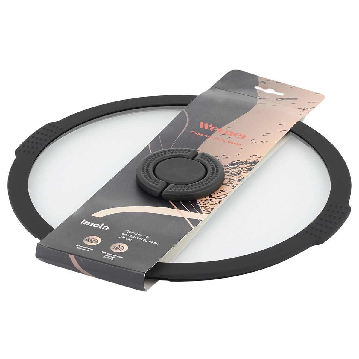 WERNER Крышка стеклянная IMOLA 24см с силиконовым ободком и складной нейлоновой ручкой. Цвет: черный. Материал: закаленное стекло, силикон, нейлон. 50209