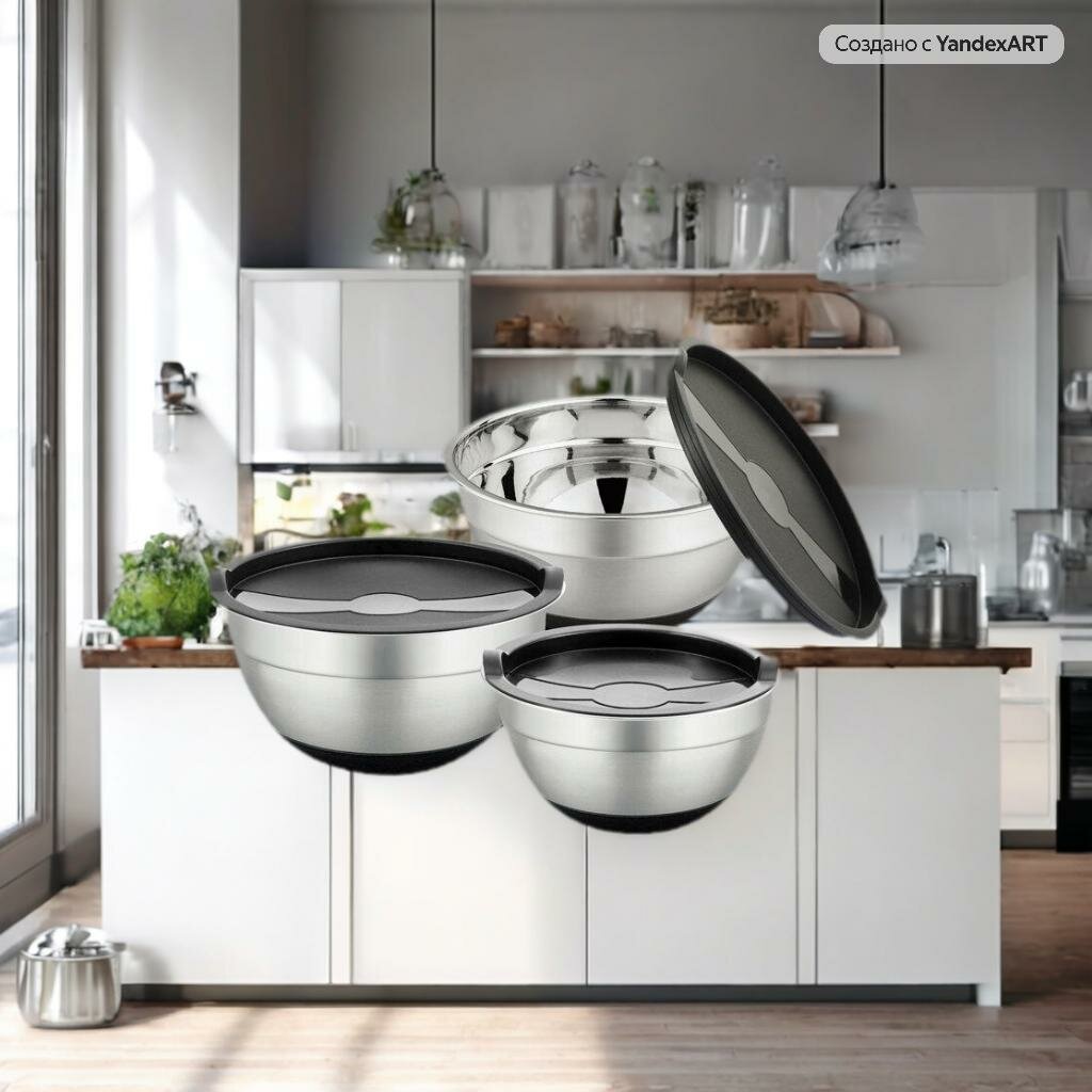 MercuryHaus / Набор мисок из нержавеющей стали / Миски с крышками. 3 шт / Салатник с крышкой/ Миска интересное: