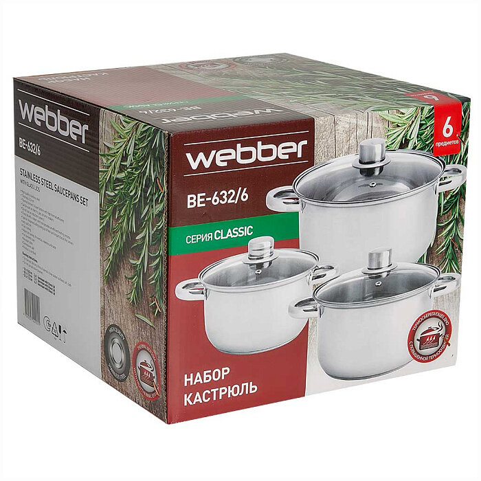 Набор посуды Webber BE-631/6 Classic, 6 предметов, для всех типов плит, нержавеющая сталь, серебристый