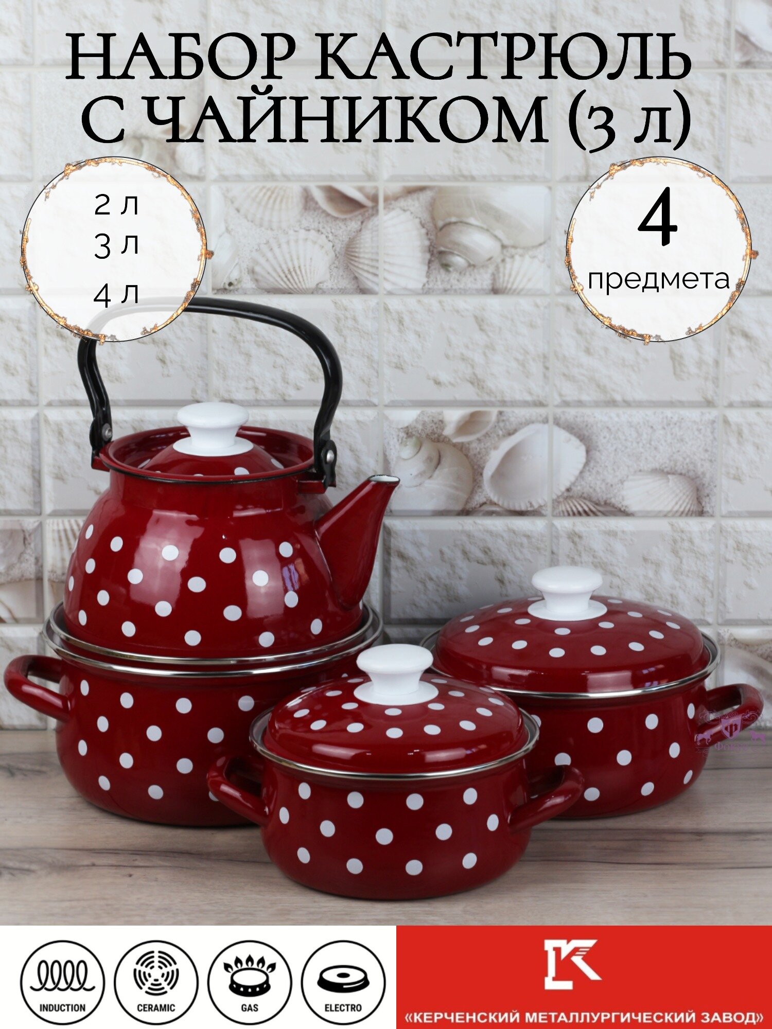 | Комплектация | 3 кастрюли: 1,5л, 2л, 3л + 3 крышки + чайник. |