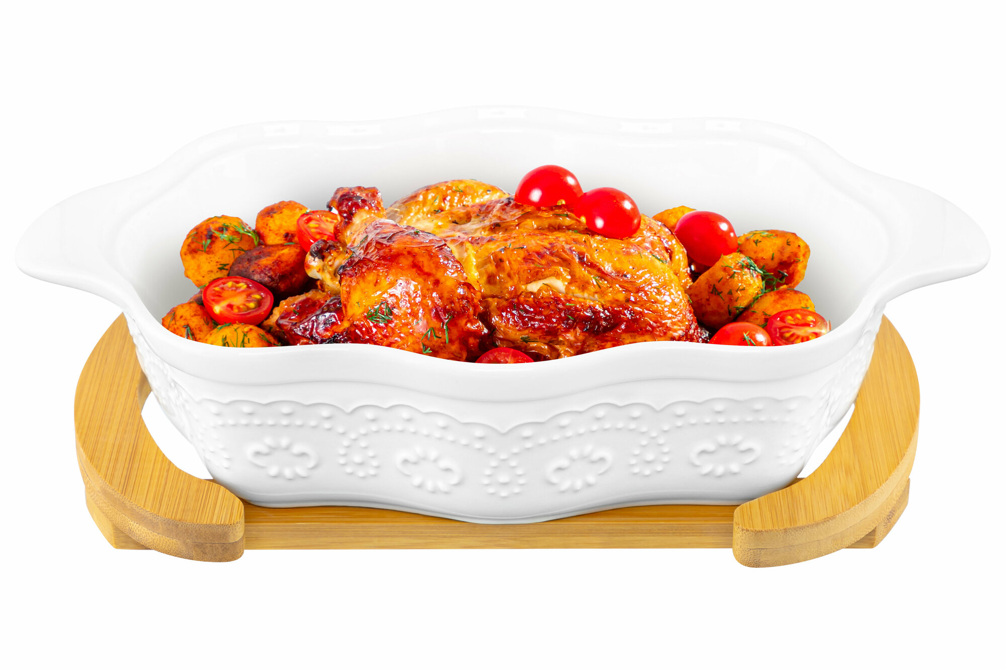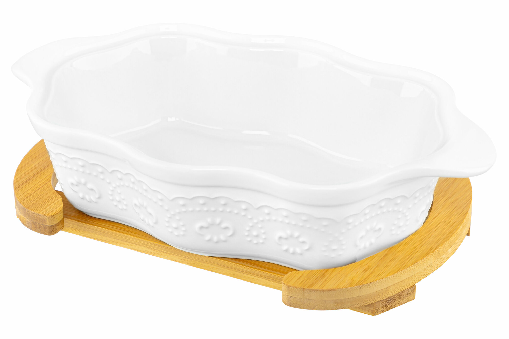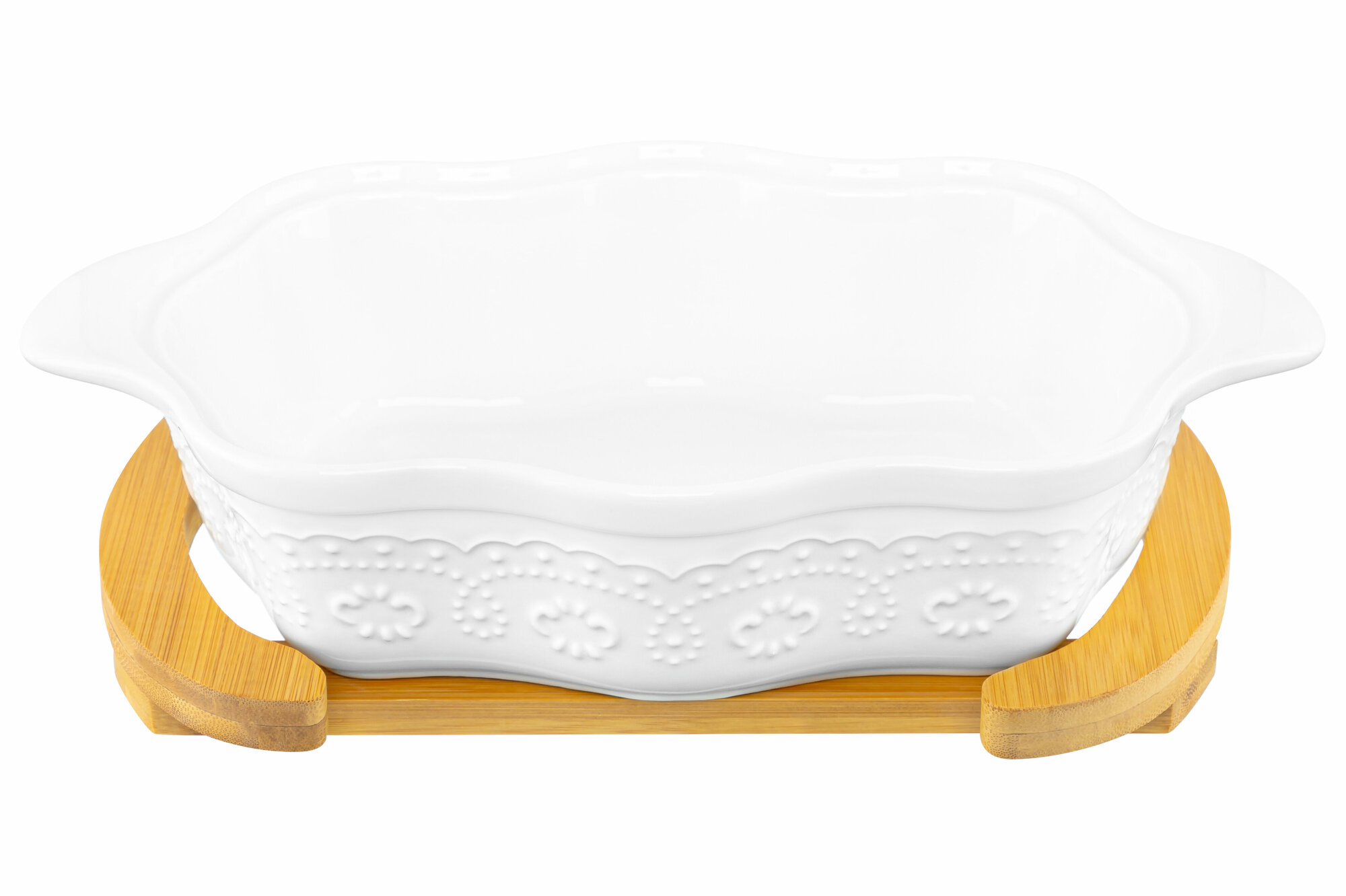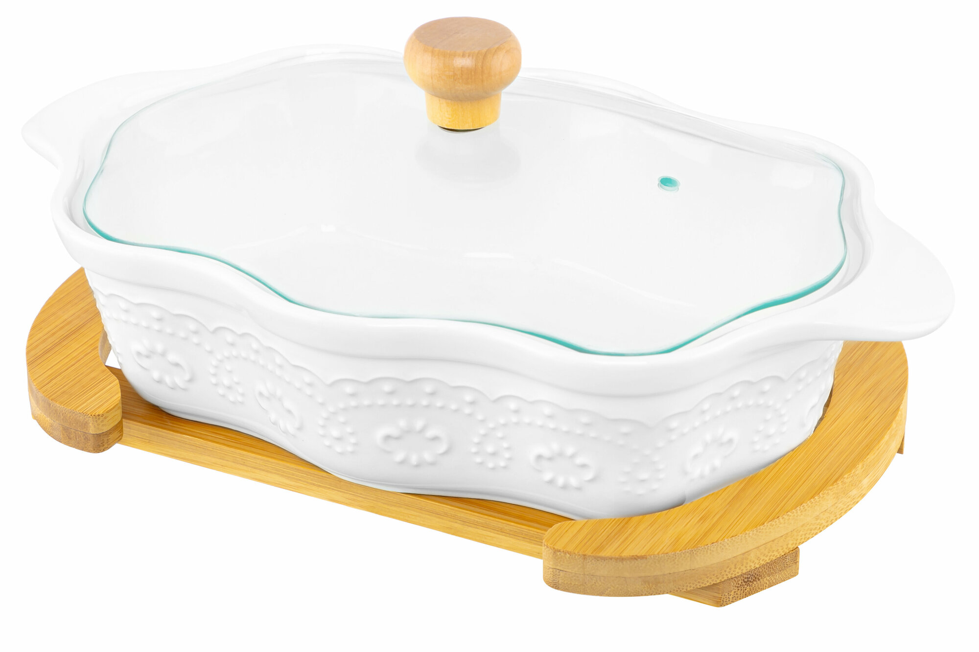 Купить Блюдо для запекания 1,5 л 32х20х14 см Elan Gallery Белый узор, ажурное со стеклянной крышкой, на деревянной подставке
