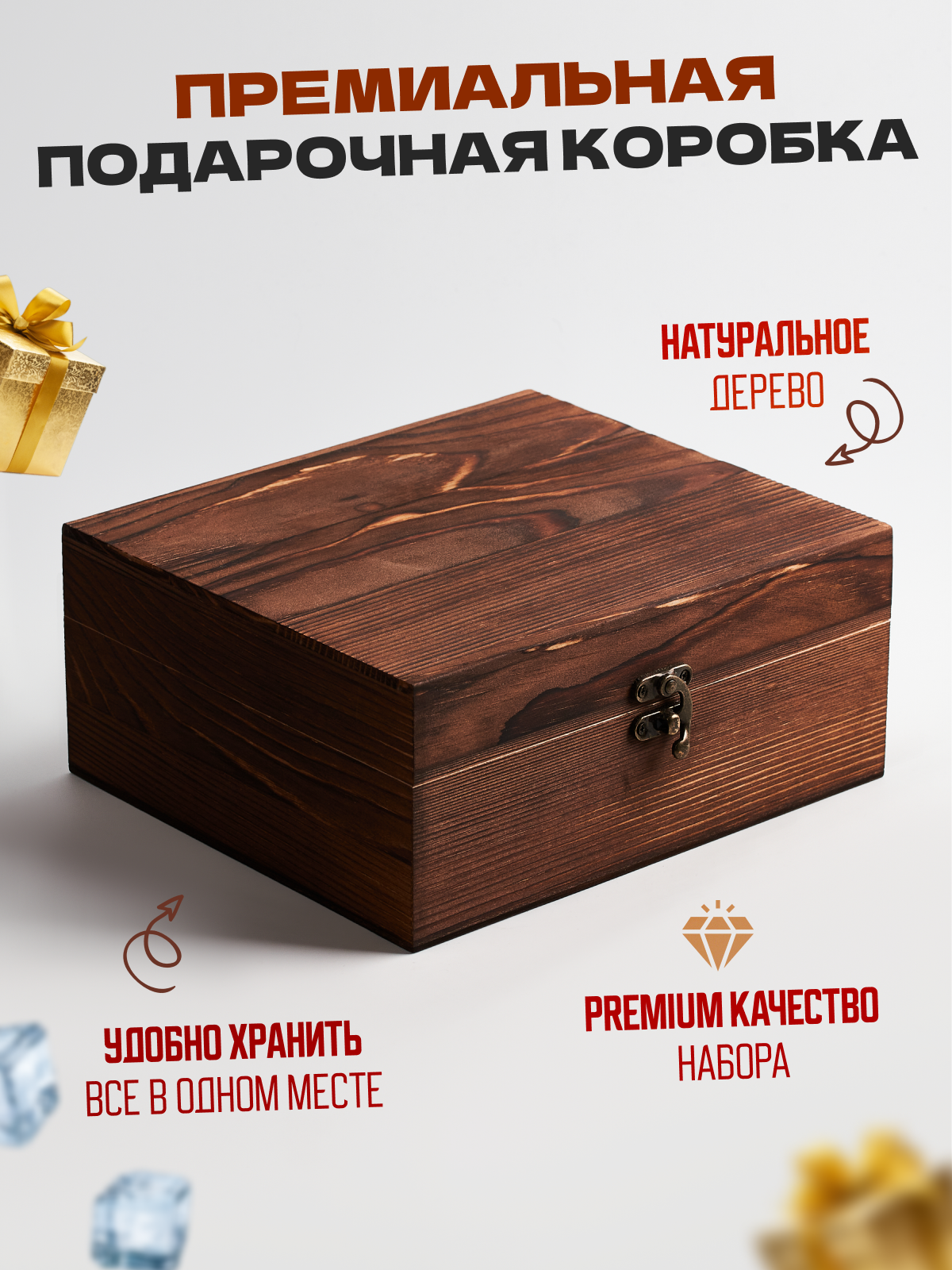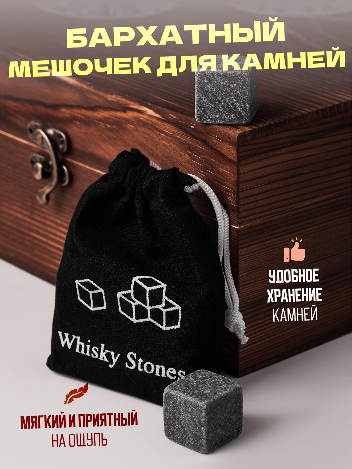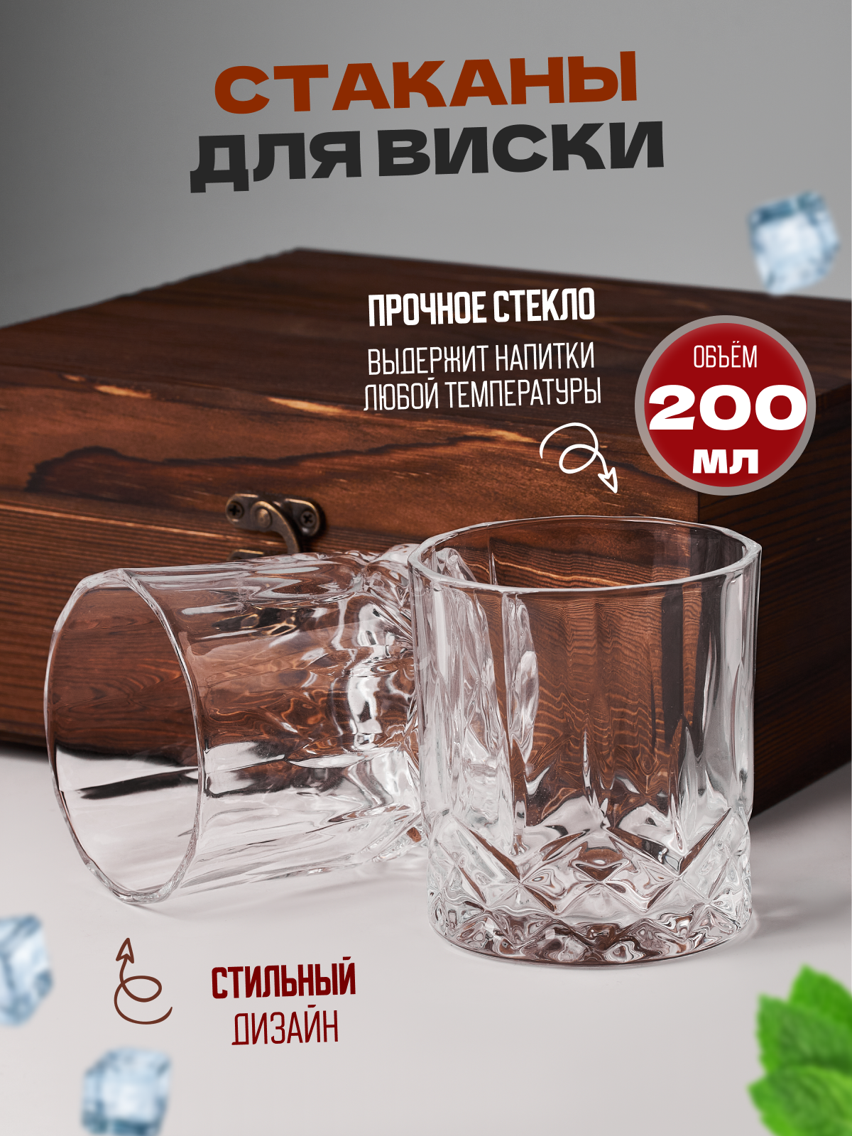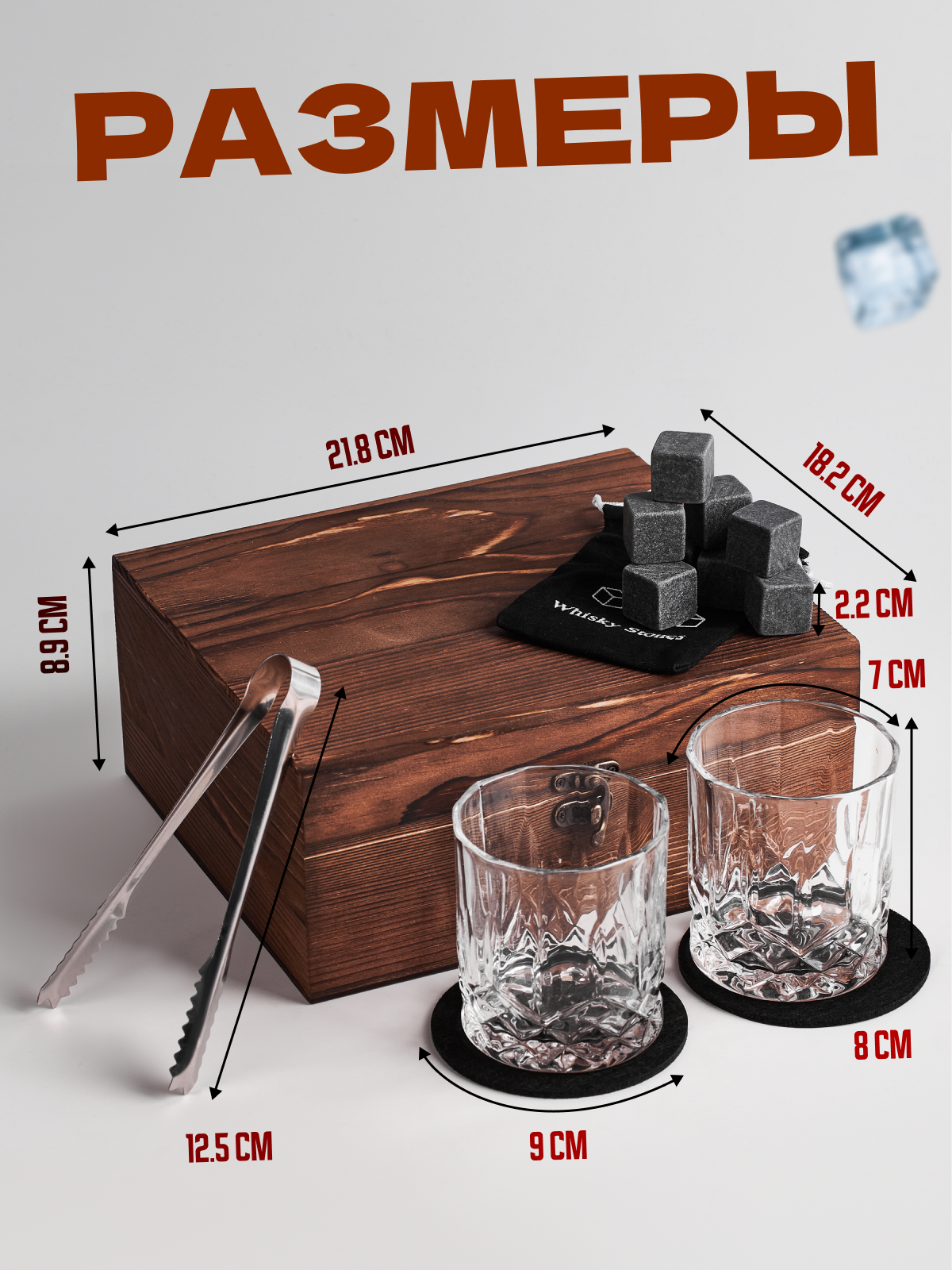 Набор для виски ( Бокалы-2 шт, Камни для виски 8 шт, щипцы, деревянная коробка) интересное: