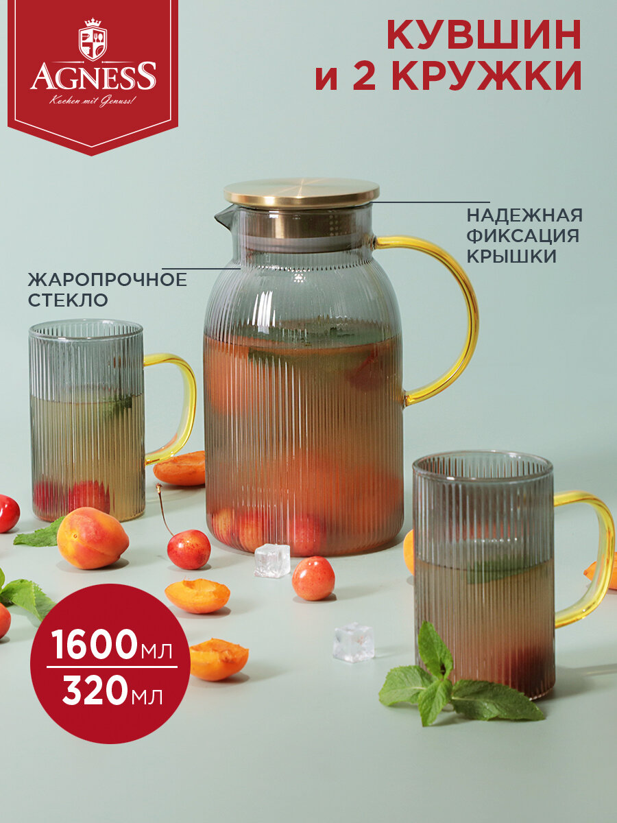 Набор: стеклянный кувшин с крышкой фильтром 1600 мл + 2 кружки 320 мл Agness "Smoky"