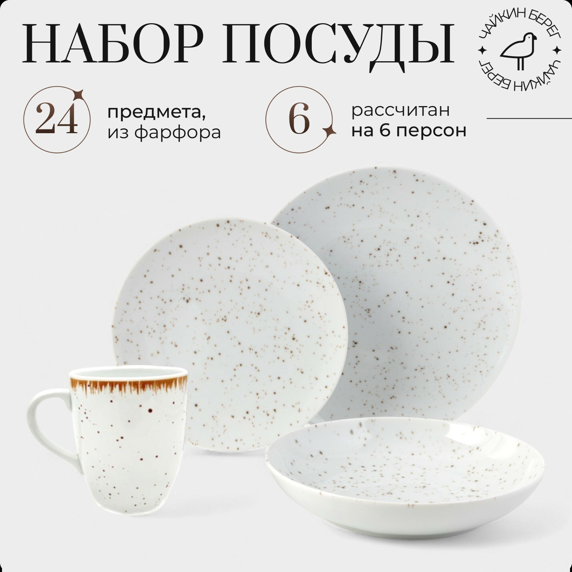 Купить Сервиз обеденный в крапинку на 6 персон с кружками, 24 предмета, набор посуды столовой из фарфора