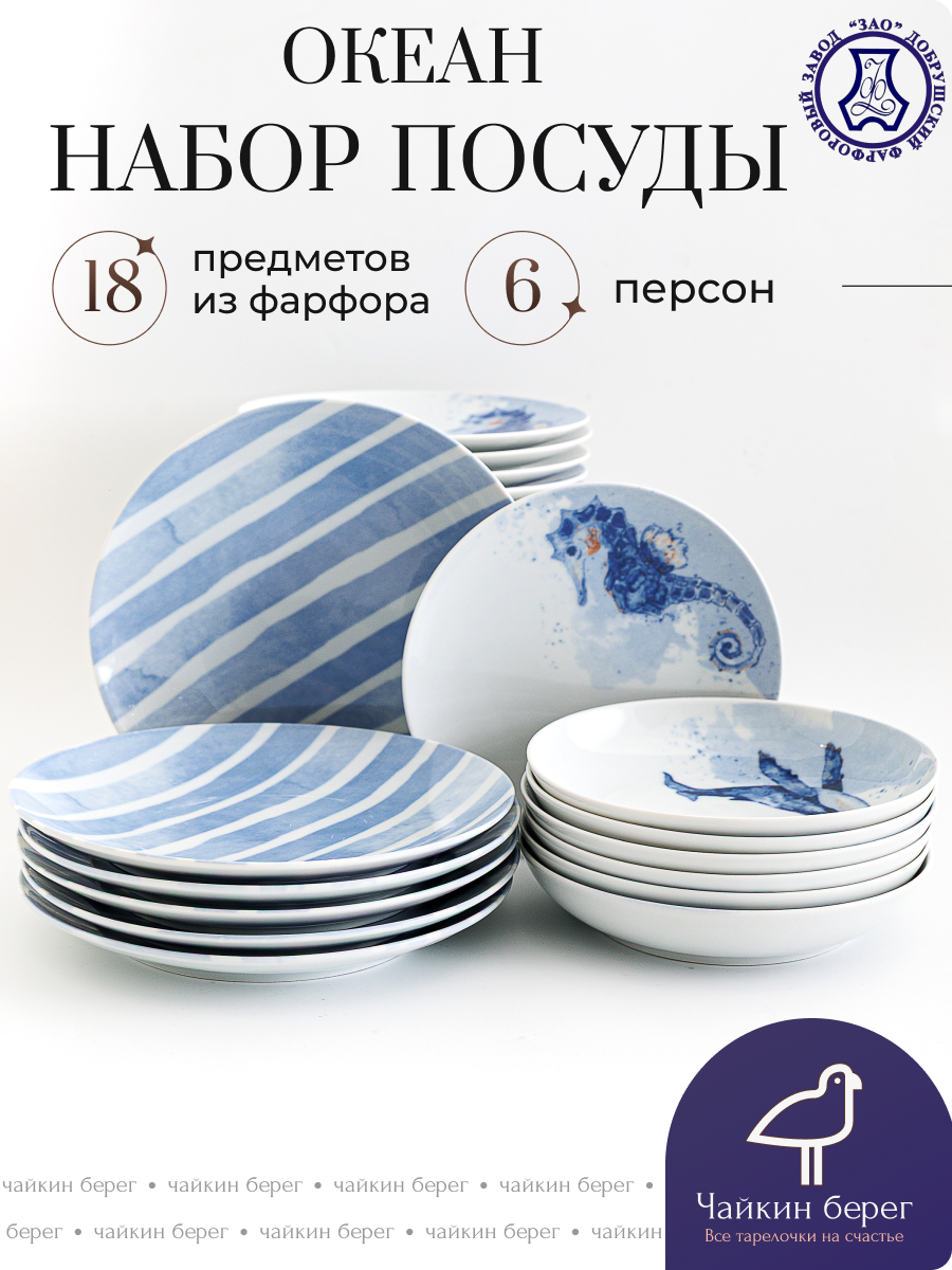 Купить Набор посуды столовой на 6 персон, 18 предметов "Океан", сервиз обеденный фарфоровый