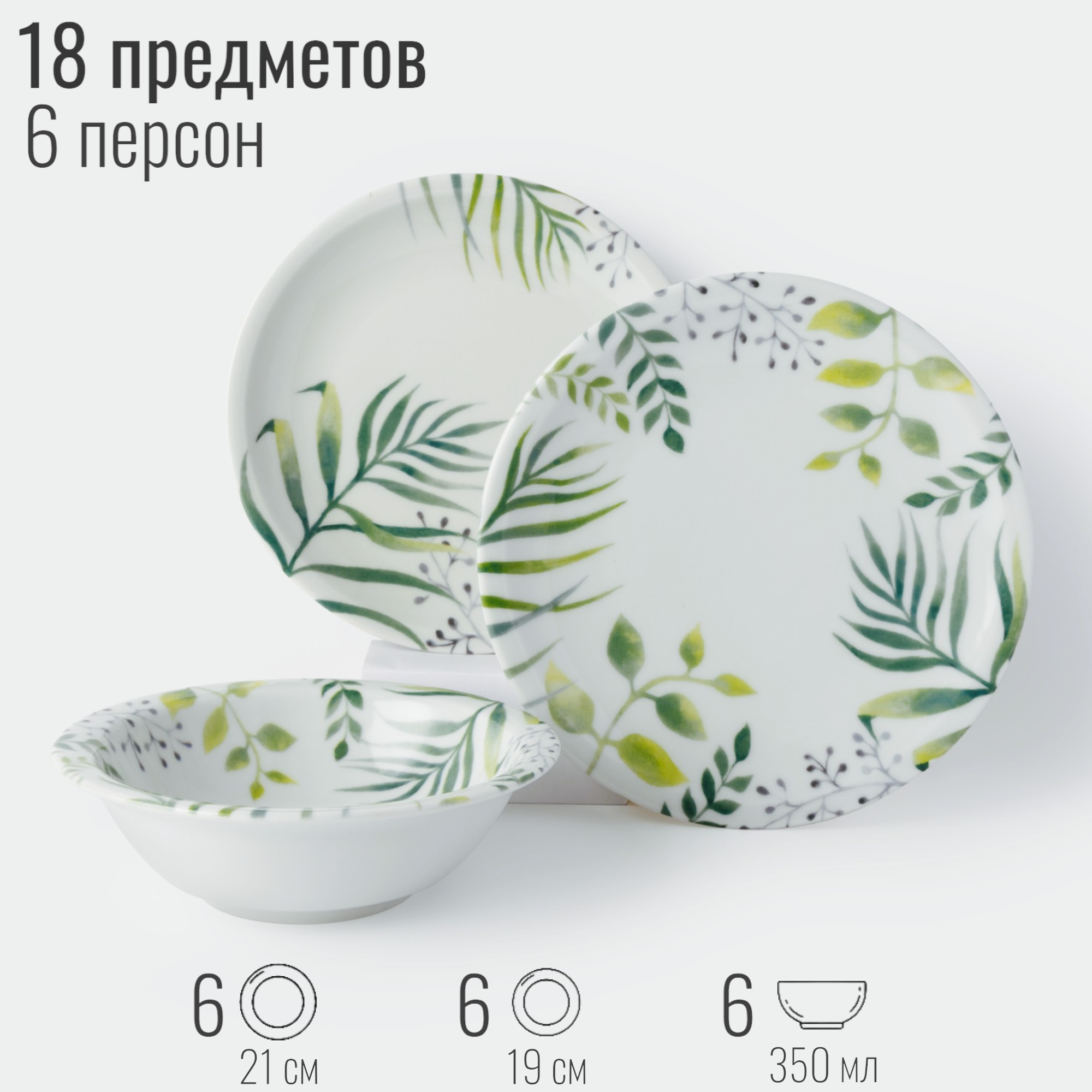 Набор посуды столовой на 6 персон, 18 предметов "Эвкалипт", сервиз обеденный, фарфор