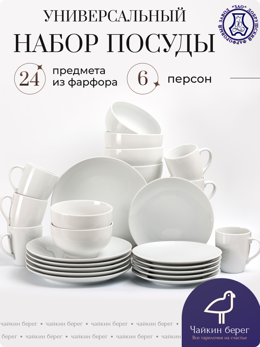 Купить Набор посуды столовой на 6 персон, белый "Универсальный" с кружками, 24 предмета, фарфор Беларусь, сервиз обеденный