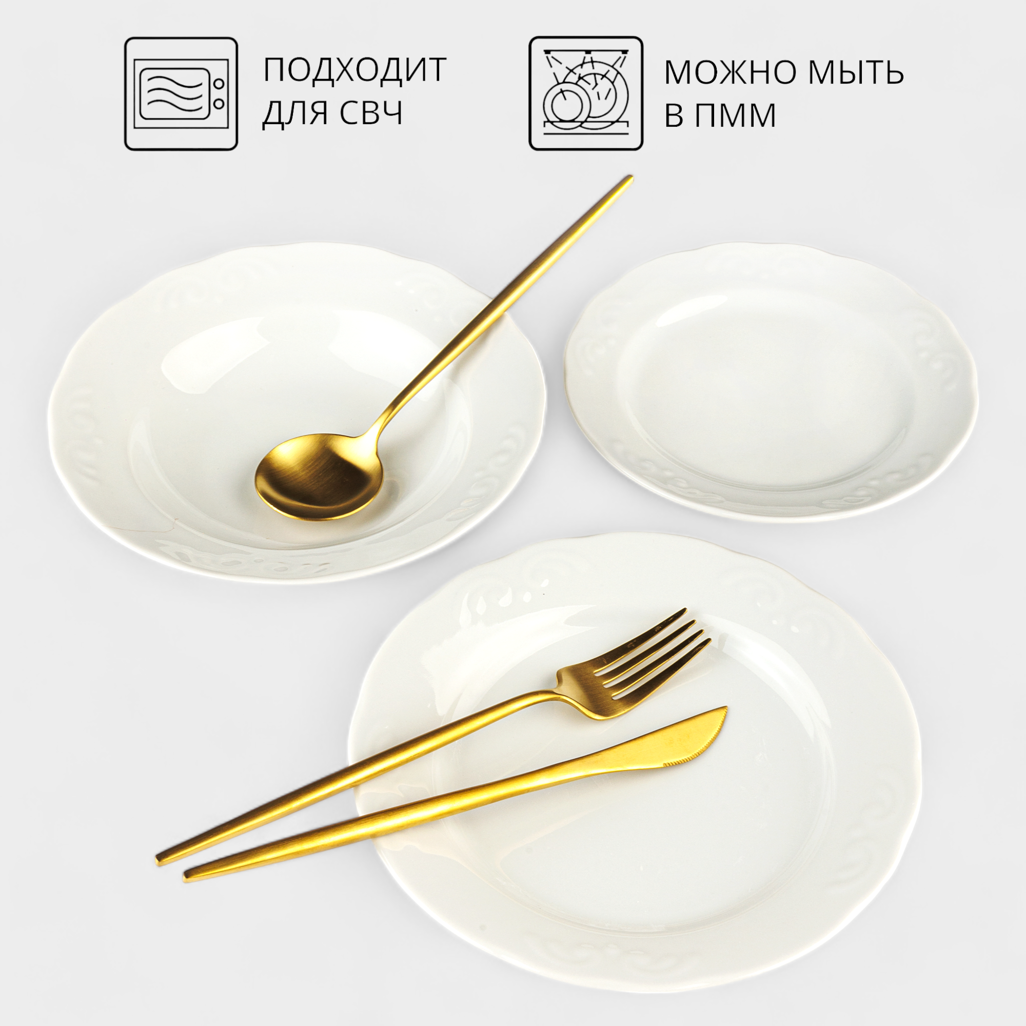 | Комплектация | Обеденная тарелка, диаметр 24 см - 6 шт. Глубокая суповая тарелка, диаметр 20 см, объем 250 мл - 6 шт. Десертная тарелка, диаметр 20 см - 6 шт. |
