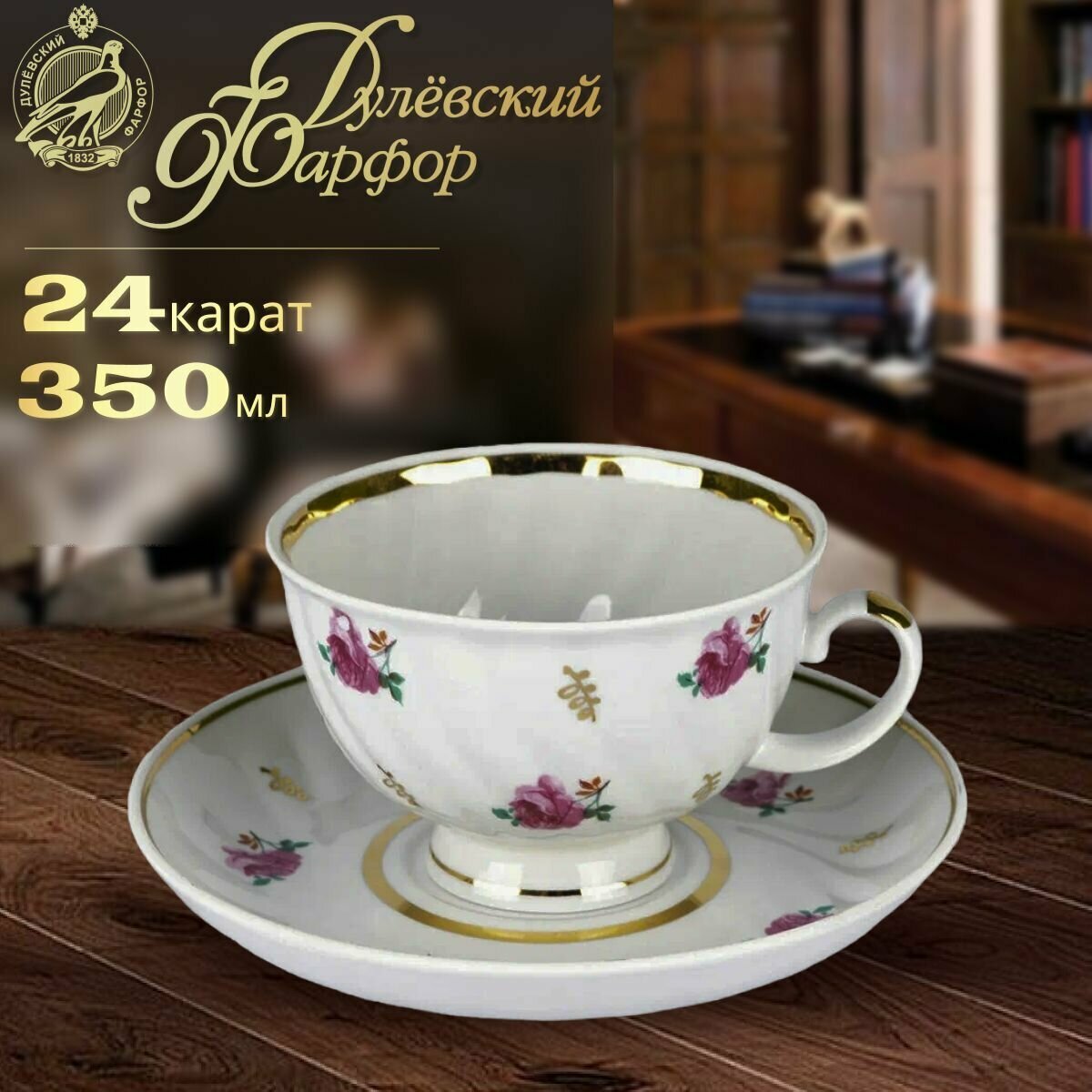 Чайная пара, чашка с блюдцем, 350 мл. Дулёвский фарфоровый завод ДФЗ. Форма "Голубая роза", рисунок "Розовый ситец". Фарфор. интересное: